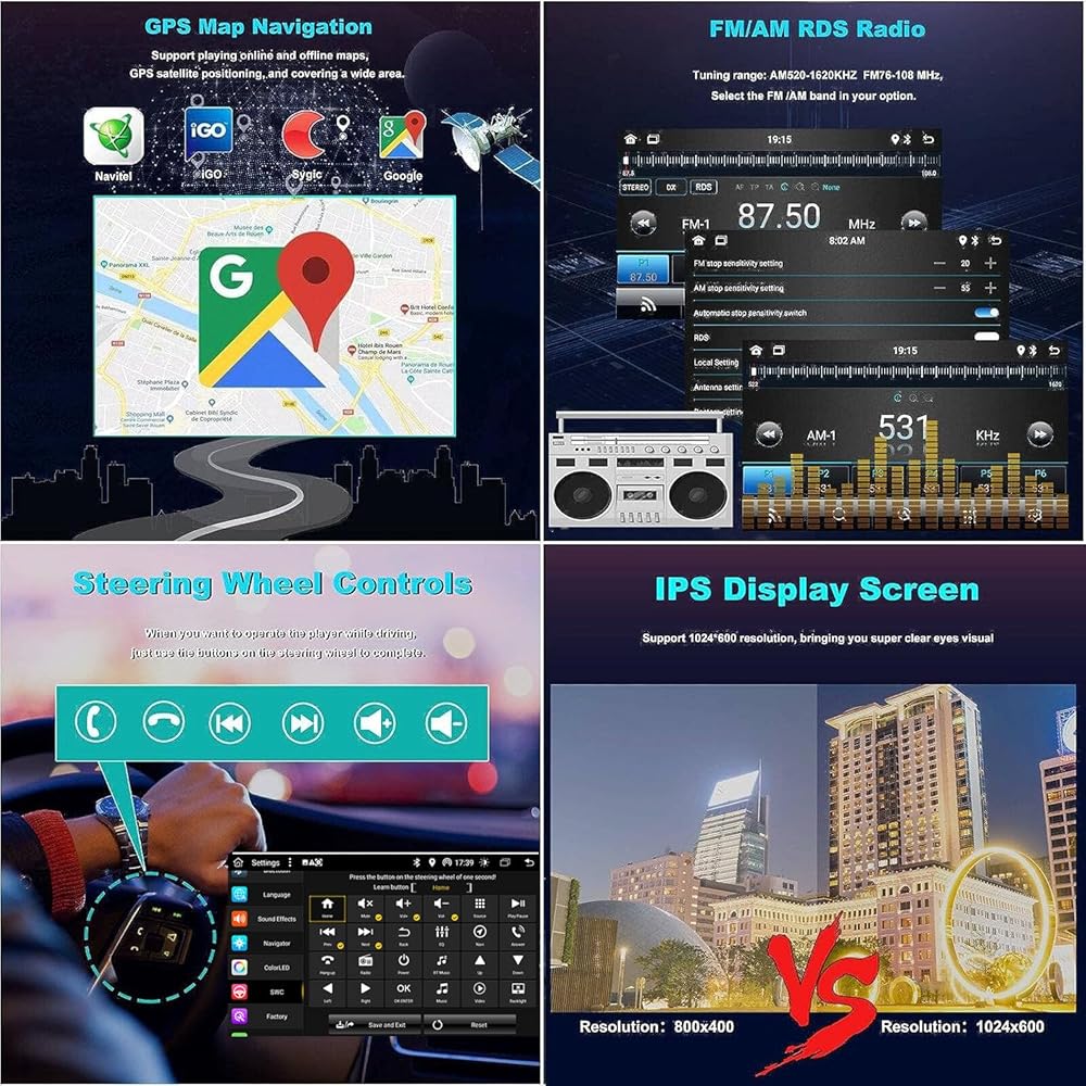 🚗【Bluetooth 5.0/GPS/Wifi】With Bluetooth 5.0 technology, the signal is more stable, and play and control your music wirelessly, free your hands and make your driving safer; Support online/offline maps, such as support IGO/Gaode/Google maps; You can download the apps you want at as well as use various Online maps through WiFi