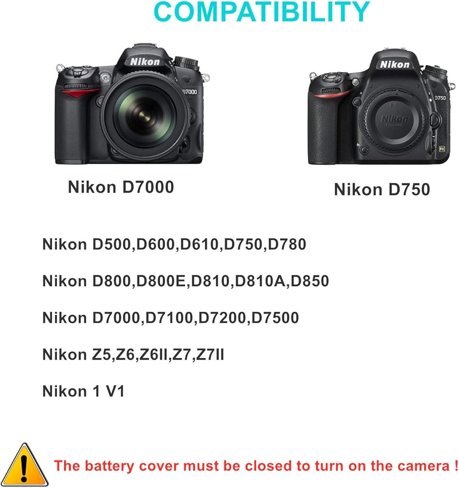 • الموديلات المتوافقة: متوافقة مع كاميرات Nikon D500 D600 D610 D750 D780 D800 D800E D810 D810A D850 D7000 D7100 D7200 D7500 Z5 Z6 Z6II Z7 Z7II 1V1. يرجى التحقق من صفحة تفاصيل المنتج للحصول على تفاصيل التكيف أو إرسال بريد إلكتروني إلى فريق خدمة العملاء لدينا للتشاور