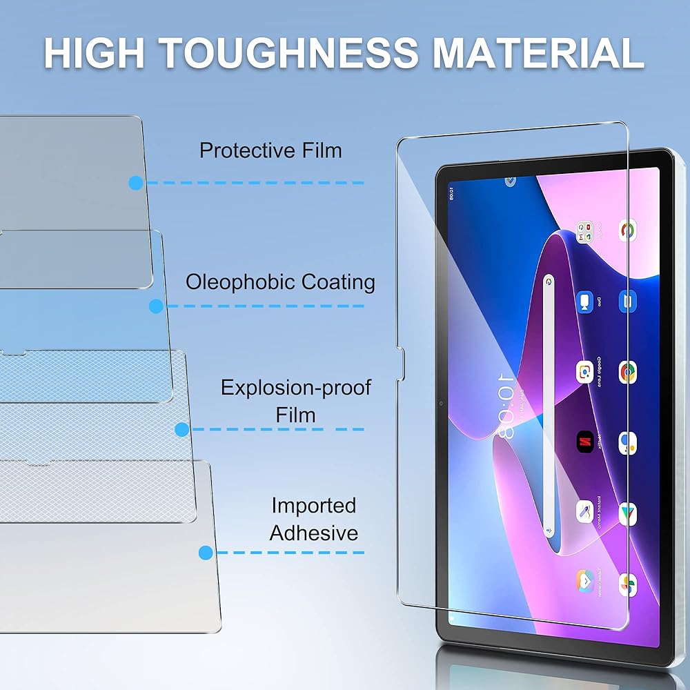 الزجاج المقسى: توفر حساسية اللمس العالي شعورًا "بلمسة حقيقية" وتضمن أداء الاستجابة السريعة. يتميز واقي الزجاج المقوى هذا بنفاذية خفيفة بنسبة 99.99%. يحافظ على جودة الشاشة الأصلية لجهاز Lenovo Tab M10 Plus (الجيل الثالث) 2022، مما يمنحك تجربة استخدام واضحة للغاية.