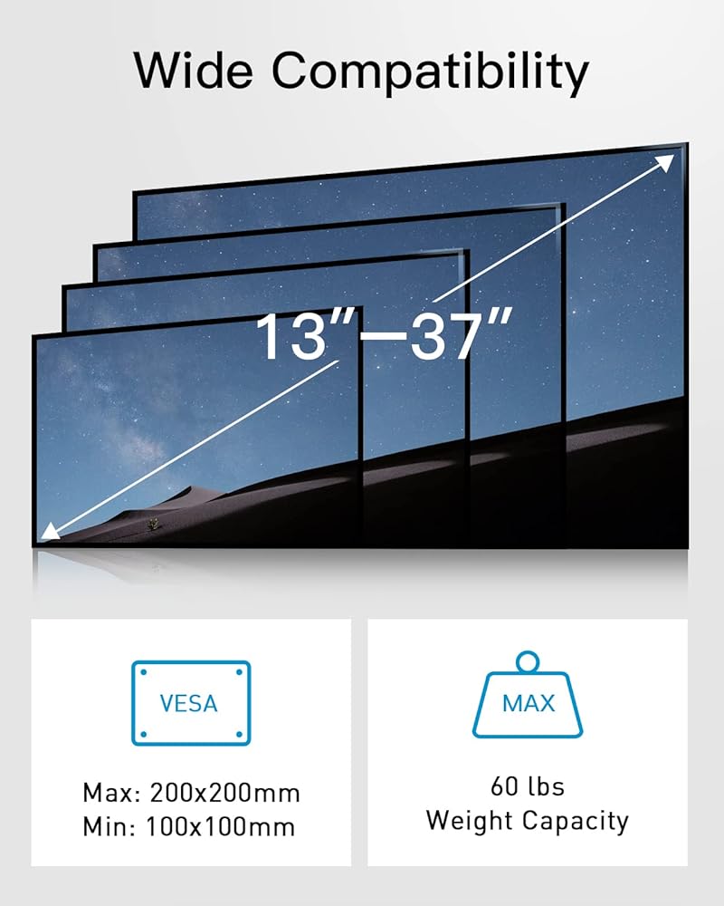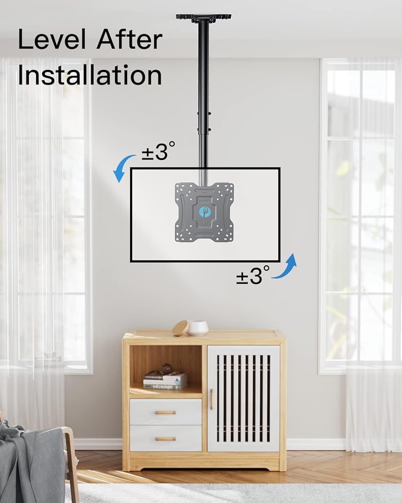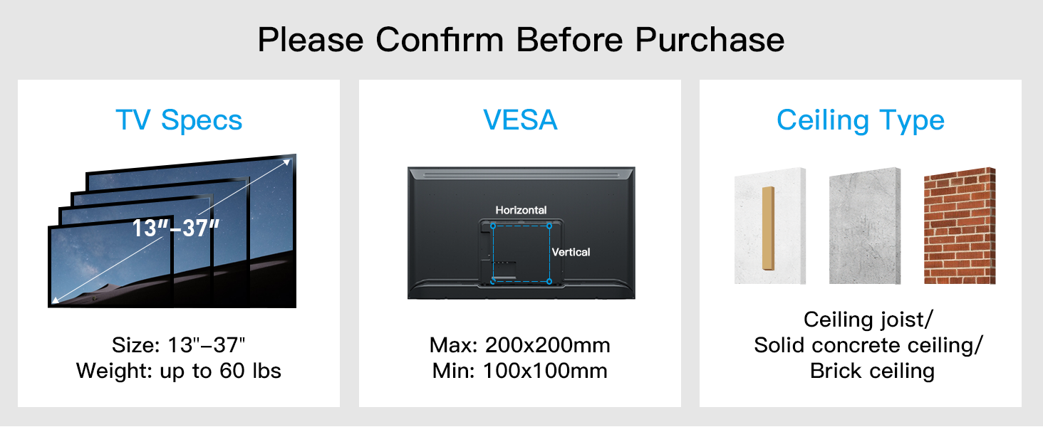 توافق واسع: يناسب حامل السقف هذا معظم أجهزة التلفزيون مقاس 13 بوصة - 37 بوصة حتى 60 باوند مع أنماط تثبيت فيسا من 100 × 100 إلى 200 × 200 ملم. يرجى التحقق من حجم ووزن ونمط فيسا للتلفزيون الخاص بك قبل الشراء.