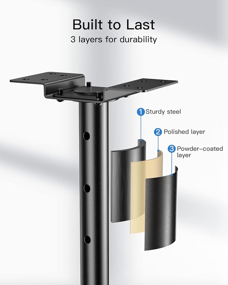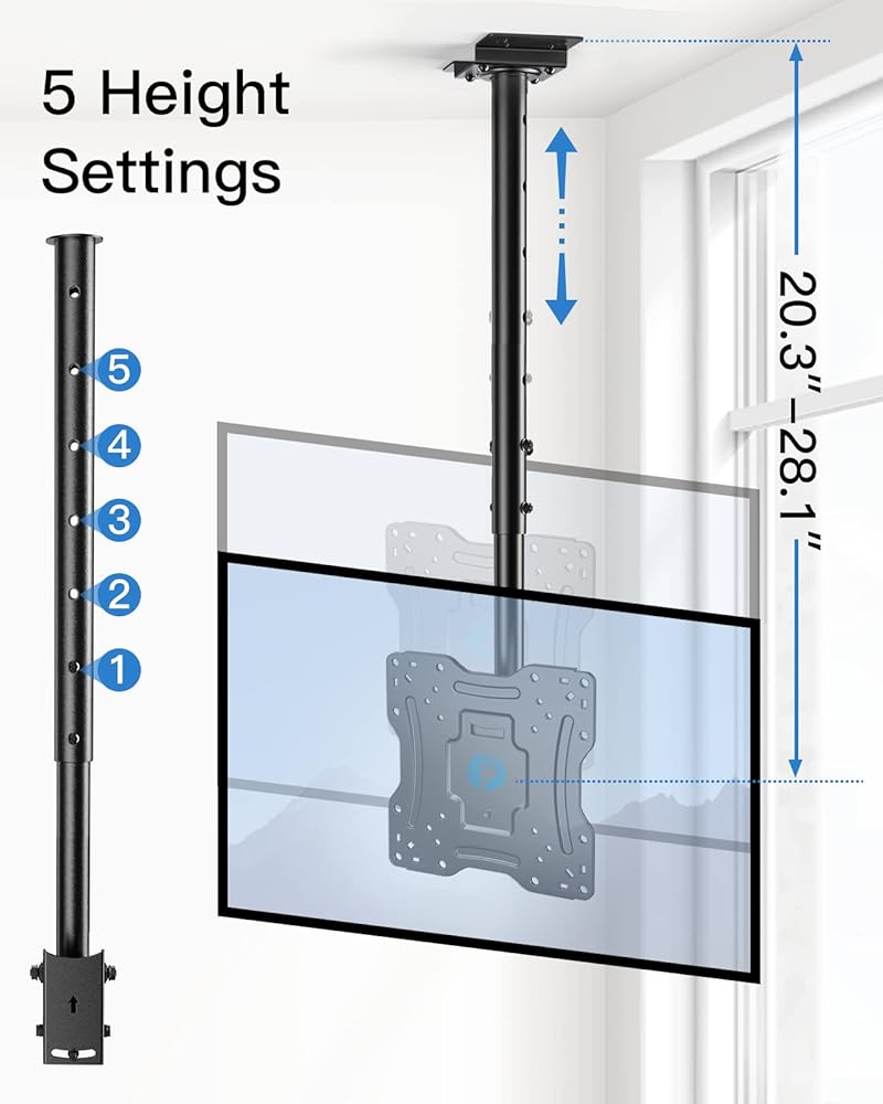5 إعدادات للارتفاع: يمكن أن يمتد حامل السقف للتلفزيون من 51.5 سم إلى 71.5 سم من السقف إلى لوحة التلفزيون للحصول على وضع عرض مثالي. يمكنك ضبط الارتفاع بسهولة بفضل التصميم المتداخل لعمود الدعم.