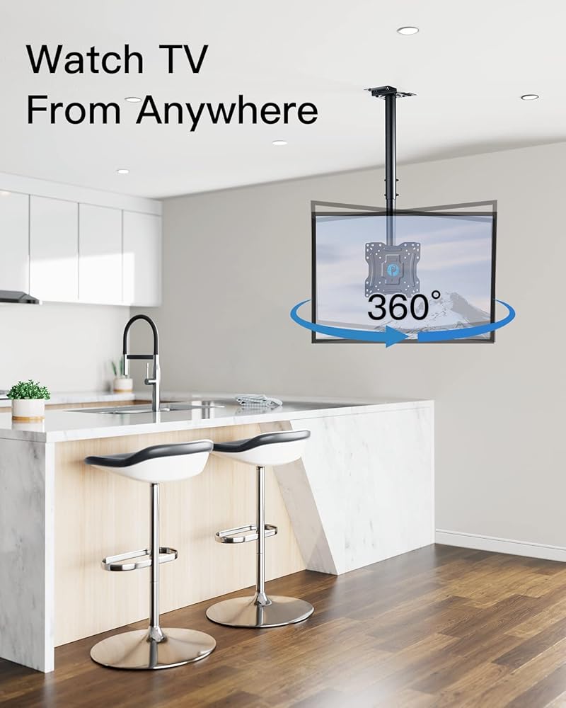 توفير المساحة: في الحالات التي لا يكون فيها التثبيت على الحائط خيارًا، فإن حامل التلفزيون المعلق من السقف هو الحل الأفضل. إذا كنت بحاجة إلى حامل تلفزيون للبار أو المكتب أو صالة الألعاب الرياضية، فإن حامل التلفزيون المثبت على الحائط هذا سيبدو رائعًا في أي غرفة.