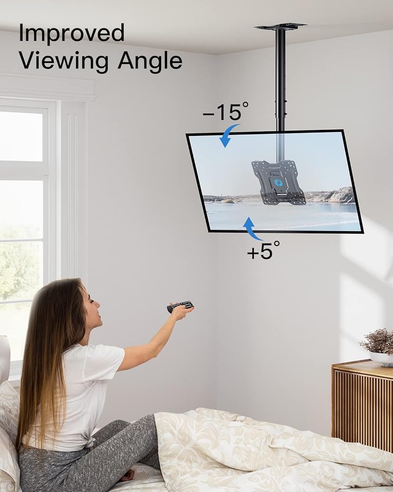 تركيب سهل: يتم تضمين دليل التعليمات التفصيلي وأدوات التثبيت القياسية لمساعدتك على تركيب التلفزيون بسهولة. يتوافق حامل السقف مع رافعة السقف الخشبية والسقف الخرساني وتركيب السقف من الطوب.
