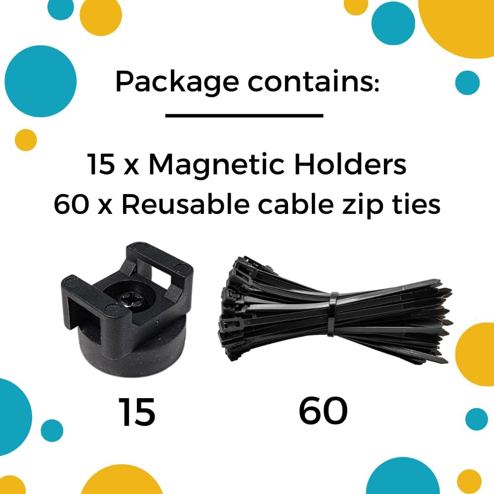 تتضمن عبوة هاتسي الخاصة بك 15 حامل ربط مغناطيسي بسحاب للكابلات (أسود) و60 رباط بسحاب قابل لإعادة الاستخدام (أسود، نايلون).