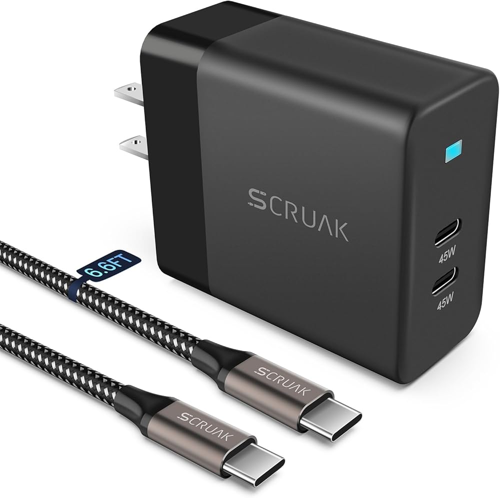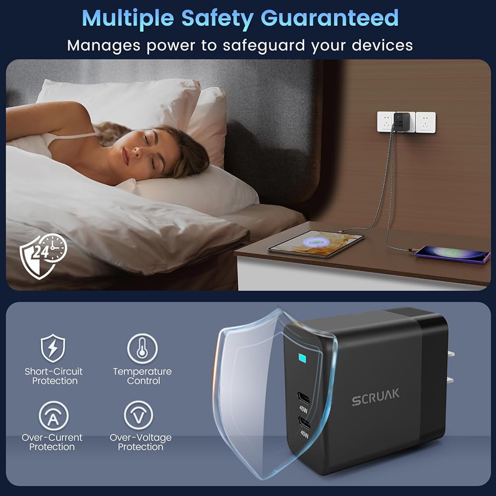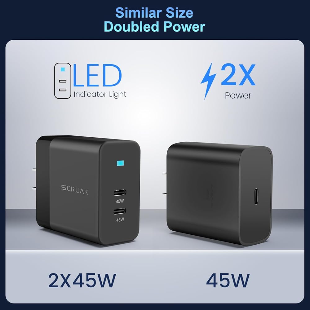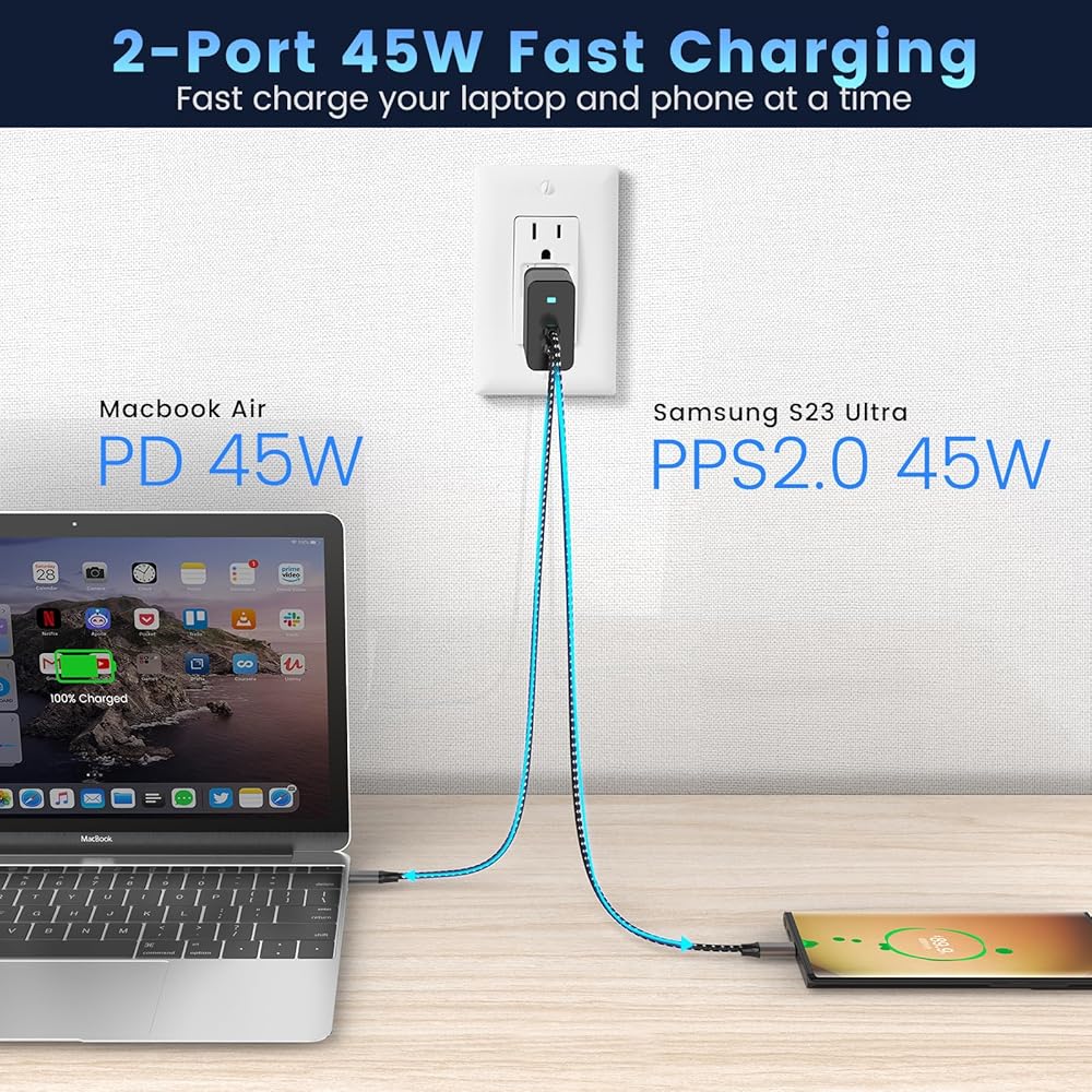 لا تتنازل عن سرعة الشحن عندما يكون لديك أجهزة متعددة (كمبيوتر محمول أو جهاز لوحي أو هاتف...) لتشغيلها. يتميز الشاحن السريع USB C ثنائي المنفذ بقدرة 45 وات بمنفذي USB عالي السرعة، مما يتيح لك شحن أجهزة متعددة بسرعة في وقت واحد.