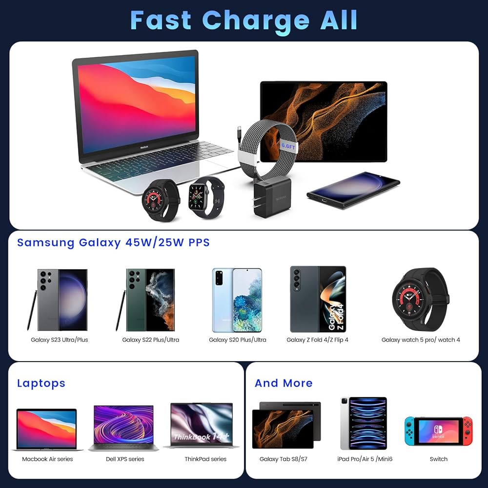 طقم شاحن سامسونج فائق السرعة بمنفذين 45 وات من النوع C لهاتف سامسونج جالاكسي S23 Ultra/S23+/S23/S22 Ultra/S22+/S22/Macbook Air XPS...