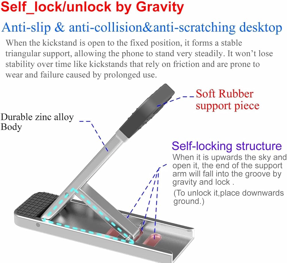 [3 زوايا قفل ذاتي، دعم مثلث ثابت، استخدام متين] عندما يكون المسند مفتوحًا على الزوايا الثابتة، فإنه سيغلق ذاتيًا ويشكل دعمًا مثلثًا ثابتًا، مما يسمح للهاتف بالوقوف بثبات شديد. لن تفقد ثباتها بمرور الوقت مثل المساند التي تعتمد على الاحتكاك وتكون عرضة للتآكل والفشل الناتج عن الاستخدام لفترة طويلة.