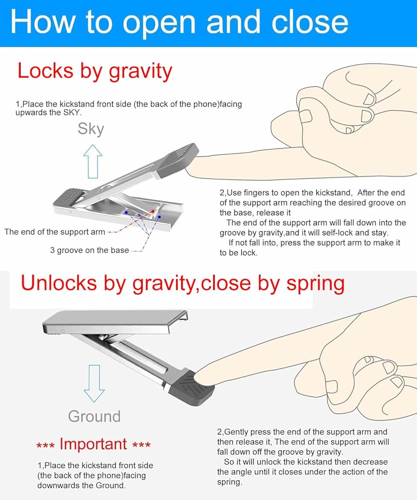 [خفيف ورفيع، سهل الاستخدام]: حجم المسند هو 53.3*14.2*3.5 ملم (2.1 بوصة*0.56 بوصة*0.14 بوصة) والحد الأقصى للوزن في حدود 0.46 أونصة (13 جم). امسح السطح الأملس حيث تريد لصقه على الظهر من الهاتف، انزع طبقة الحماية، وألصق المسند واضغط للتأكد من تثبيته بإحكام وبشكل كامل.