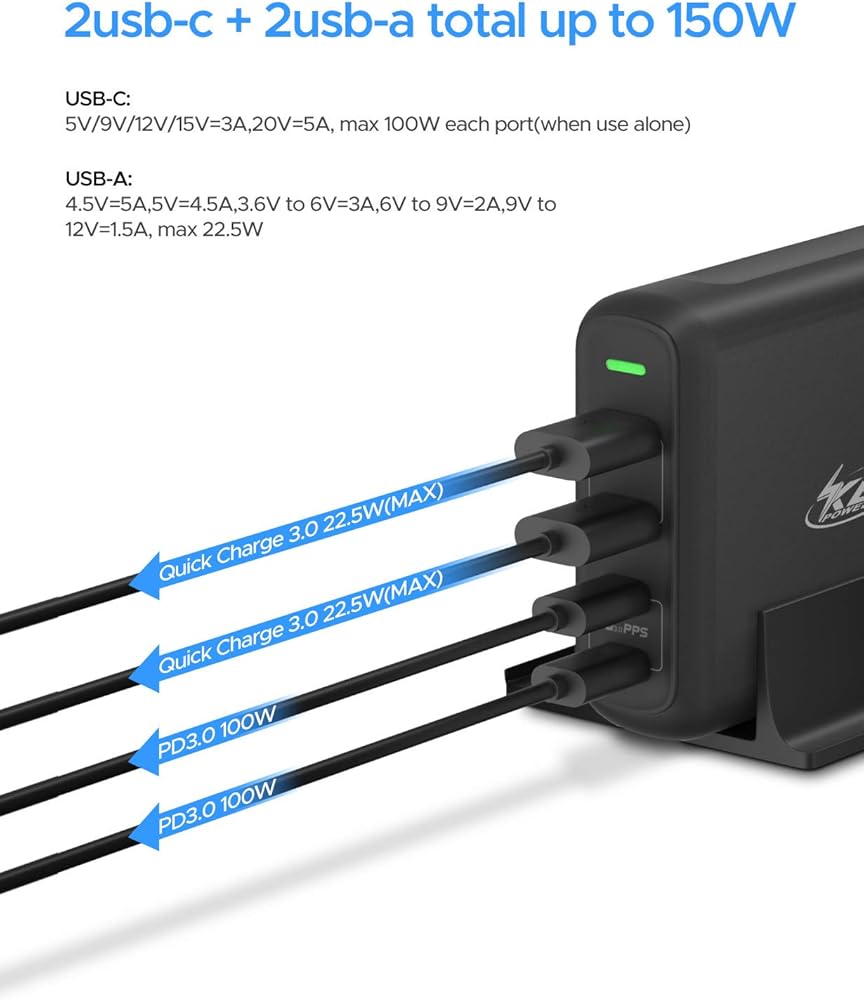 USB C Charger ، محطة شاحن Multi Multi Multi Power الرئيسية مع 2 منافذ USB-C ومنافذ USB-A شاحن سريع ، شاحن سريع PD لـ iPhone 15/14/12/11/Airpod/Pro/iPad/iWatch/Galaxy/ Google Pixel (150W)
