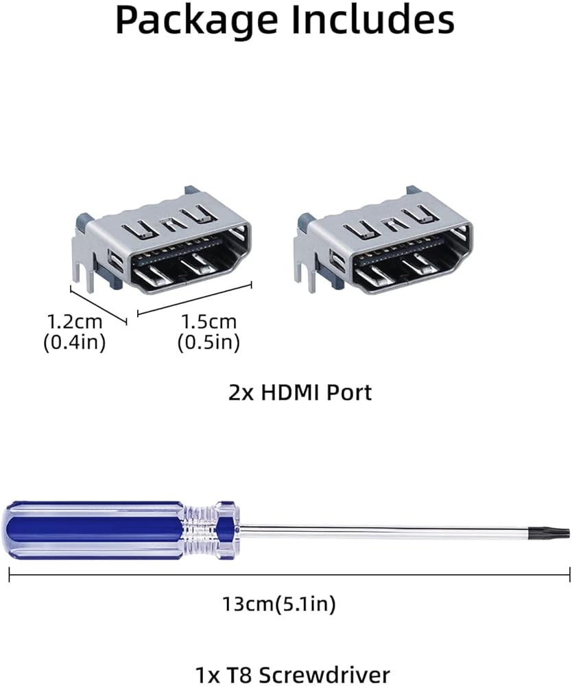 -Package includes 2 piece of Brand New Original HDMI Port Socket Connector and a Torx T8 with Hole Screwdriver.