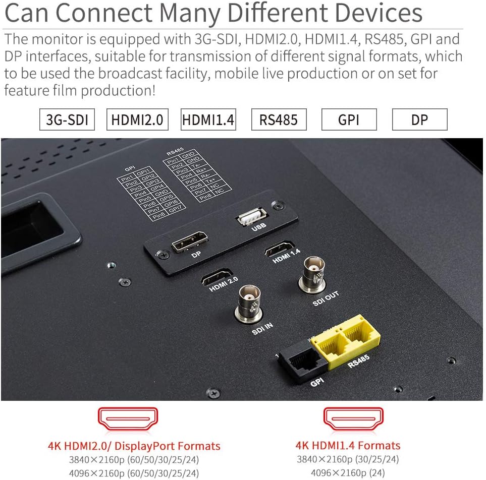【توصيل العديد من الأجهزة المختلفة】الشاشة مجهزة بواجهات 3G-SDI وHDMI2.0 وHDMI1.4 وRS485 وGPI وDP، وهي مناسبة لنقل تنسيقات الإشارة المختلفة. متعددة الاستخدامات بما يكفي لاستخدامها من منشأة البث والبث المباشر عبر الهاتف المحمول الإنتاج أو في موقع التصوير لإنتاج فيلم روائي طويل!