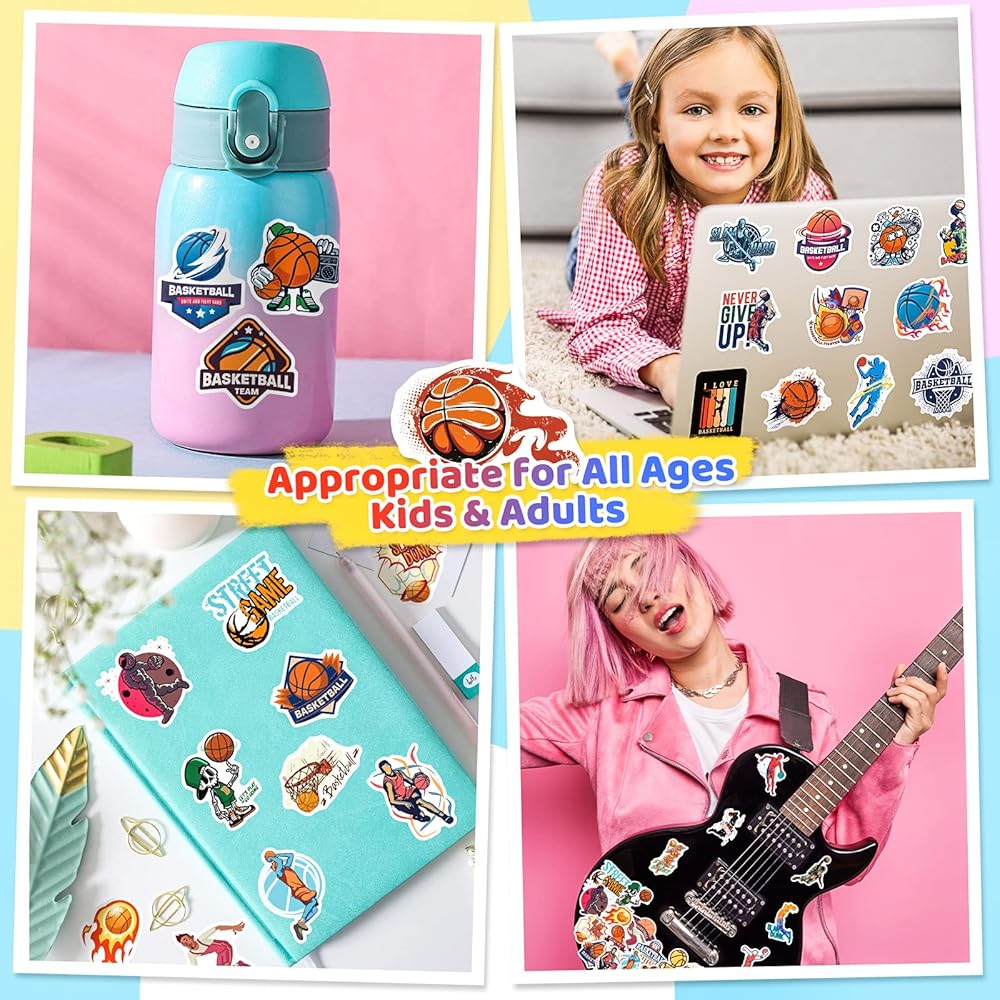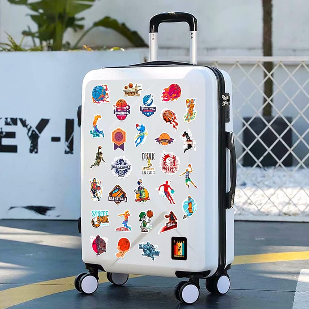 مجموعة ملصقات كرة السلة لمحبي كرة السلة والطلاب المراهقين - 50 قطعة من الملصقات والشارات ذات طابع كرة السلة لأجهزة الكمبيوتر المحمول، وزجاجات المياه، وحافظة الهاتف، والجيتار، ولوح التزلج، والأمتعة، والكمبيوتر المحمول