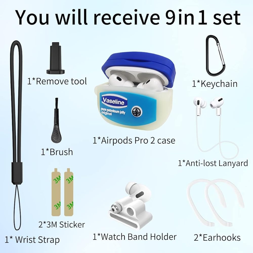 ♥【ستحصل على مجموعة 9 في 1】1 × حافظة ايربودز برو الجيل الثاني، 1 × سلسلة مفاتيح، 1 × حبل مضاد للضياع، 2 × خطاف أذن، 1 × فرشاة، 1 × حامل سوار ساعة، 1 × أدوات إزالة، 1 × حزام معصم، 2 × ملصق 3 متر. (ملاحظة: سماعات ايربودز برو 2 وعلبة شحن ايربودز برو 2 غير متضمنة.)