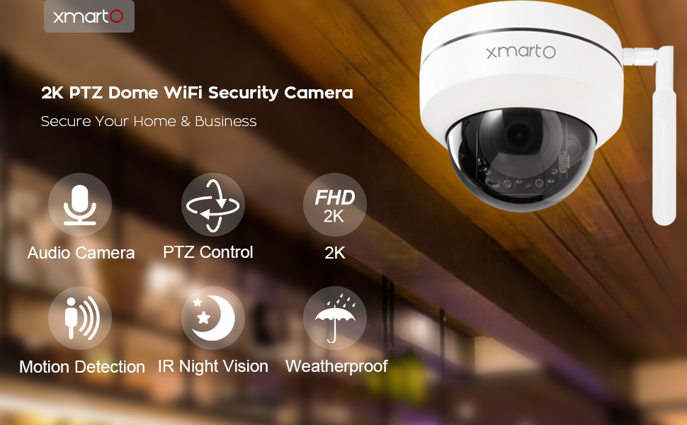 كاميرا أمان لاسلكية xmartO 2K HD Dome PTZ مع تتبع تلقائي وصوت، كاميرا مراقبة WiFi داخلية/خارجية تعمل بشكل مستقل أو مع NVR، أو التسجيل على بطاقة SD أو NVR أو التخزين السحابي