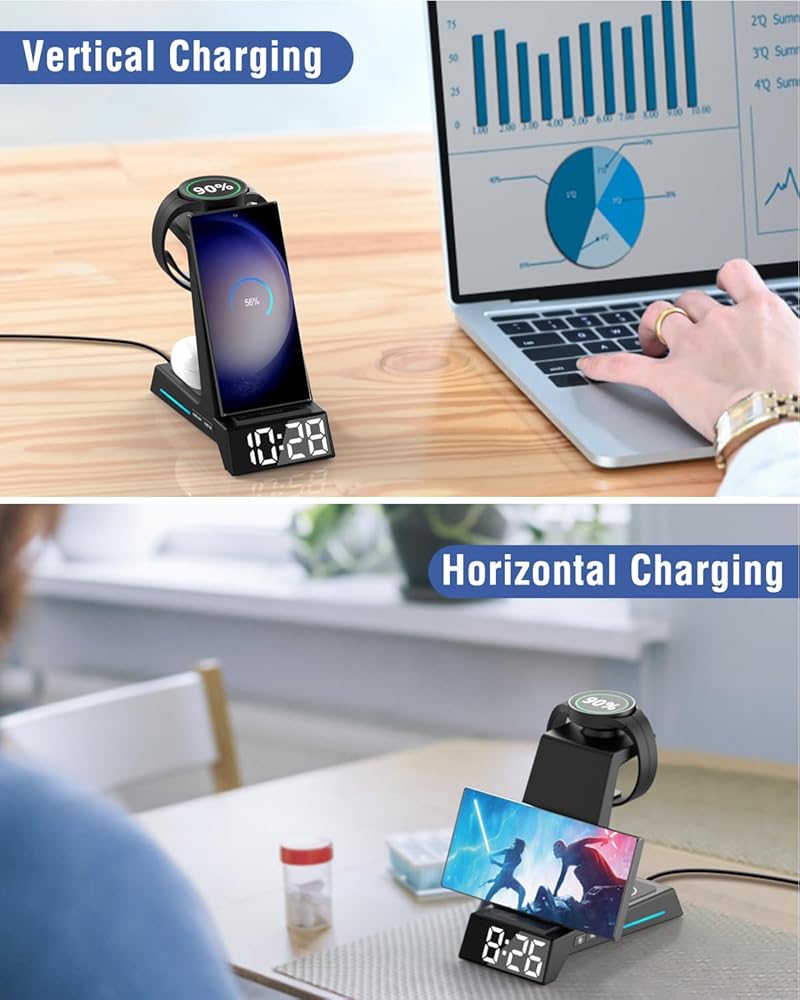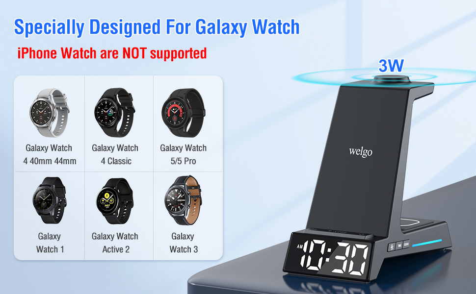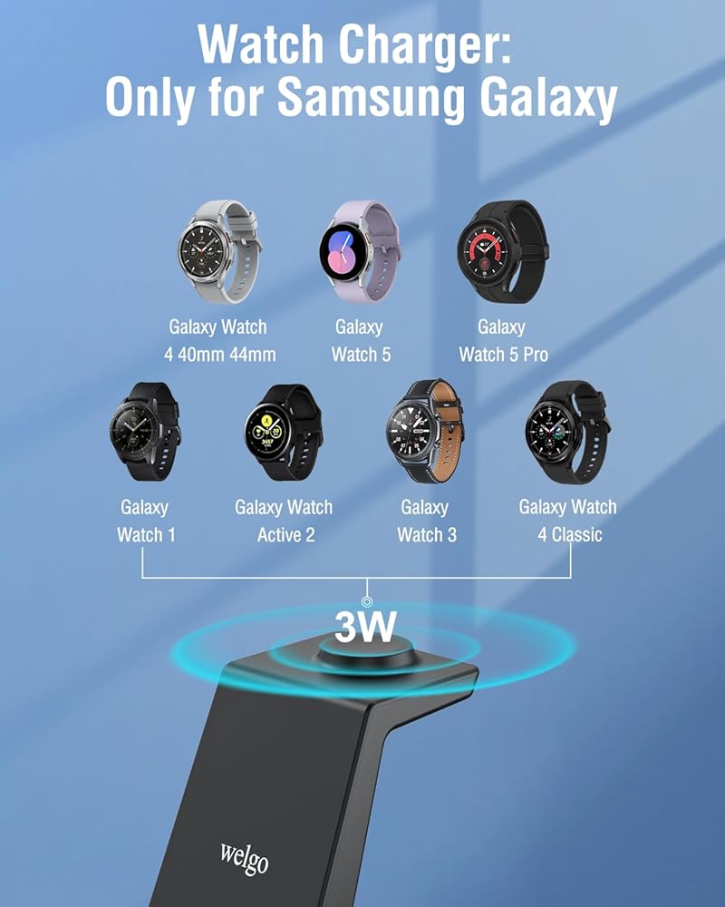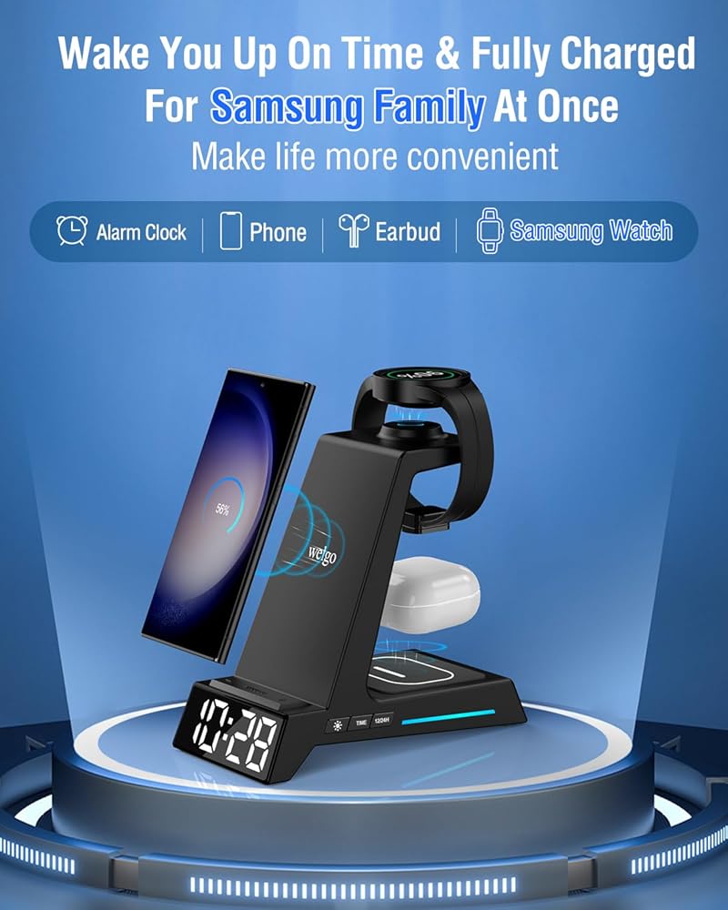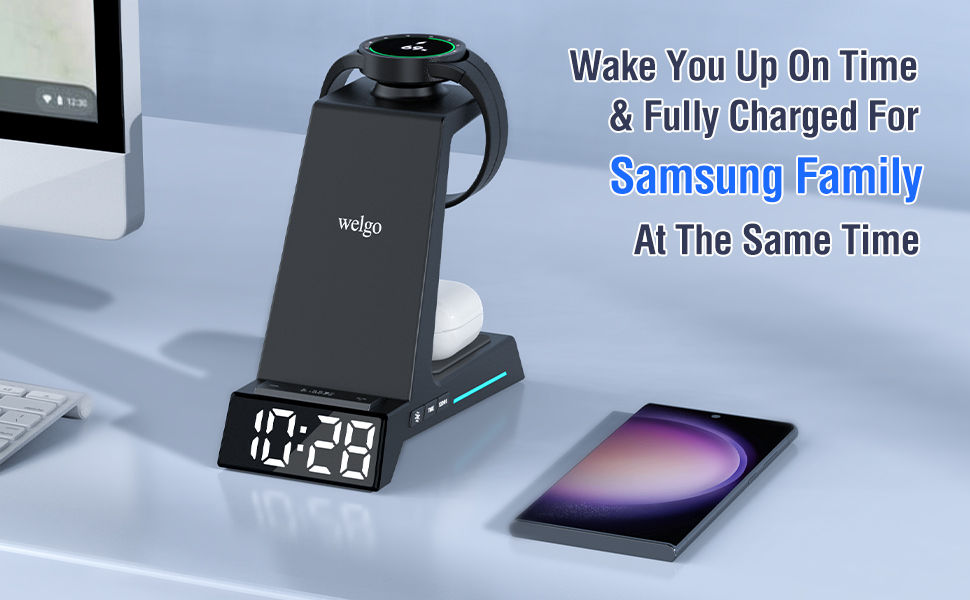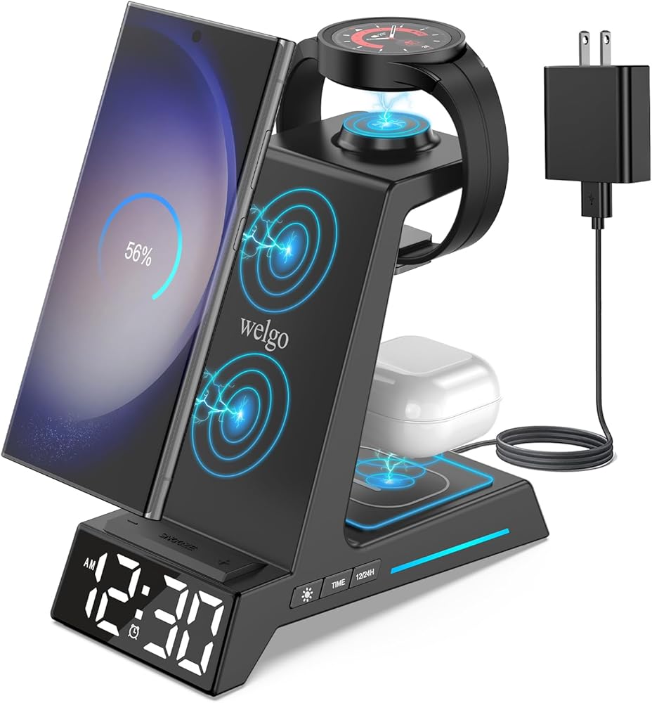 شاحن Welgo اللاسلكي لأجهزة Samsung مع ساعة منبه، محطة شحن 4 في 1 لأجهزة Samsung S23 Ultra/S22/Note 10/Z Fold4/Z Flip4/iPhone، لساعة Galaxy Watch 5 Pro/4/3 وSamsung Galaxy Buds