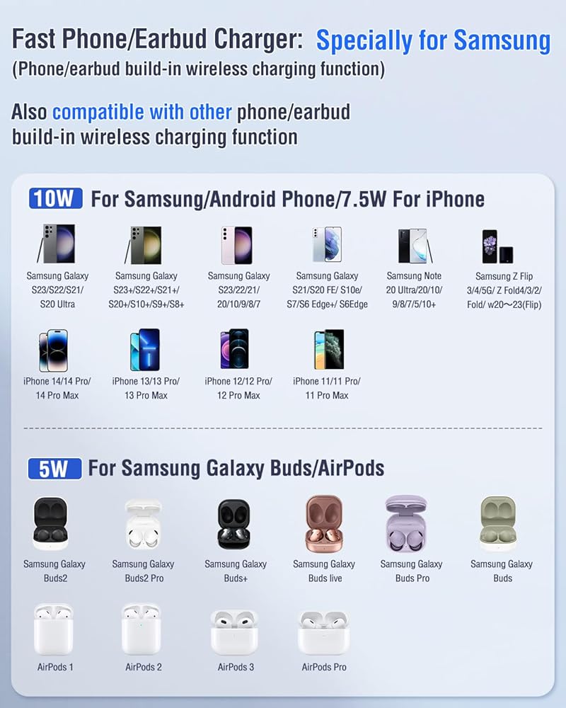 • شاحن لاسلكي عالمي للهاتف: اكتشف توافقًا لا مثيل له! يلبي مجموعة واسعة من الهواتف المحمولة التي تحتوي على وظيفة الشحن اللاسلكي المدمجة، ويدعم بسهولة سلسلة S من سامسونج (S23 إلى S7)، وسلسلة Note (Note 20 Ultra إلى Note 5)، وZ Flip (Flip3 to Flip)، وZ Fold (Fold4) للطي)، وسلسلة W (من W20 إلى W23). كما أنه مناسب تمامًا لأجهزة iPhone من السلسلة 11 إلى 15، بما في ذلك إصدارات Pro وPro Max، بالإضافة إلى سلسلة SE (2020)، وسلسلة XS، وسلسلة XR، وX، و8. استمتع براحة شحن جميع أجهزتك المتنوعة باستخدام محور عالمي واحد!