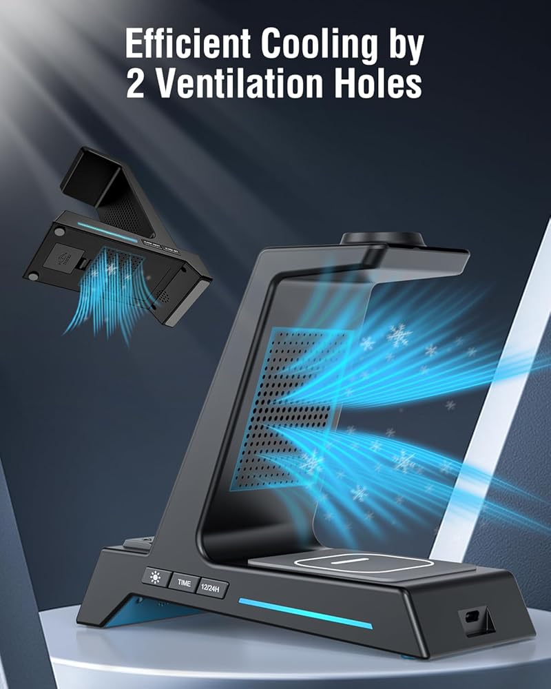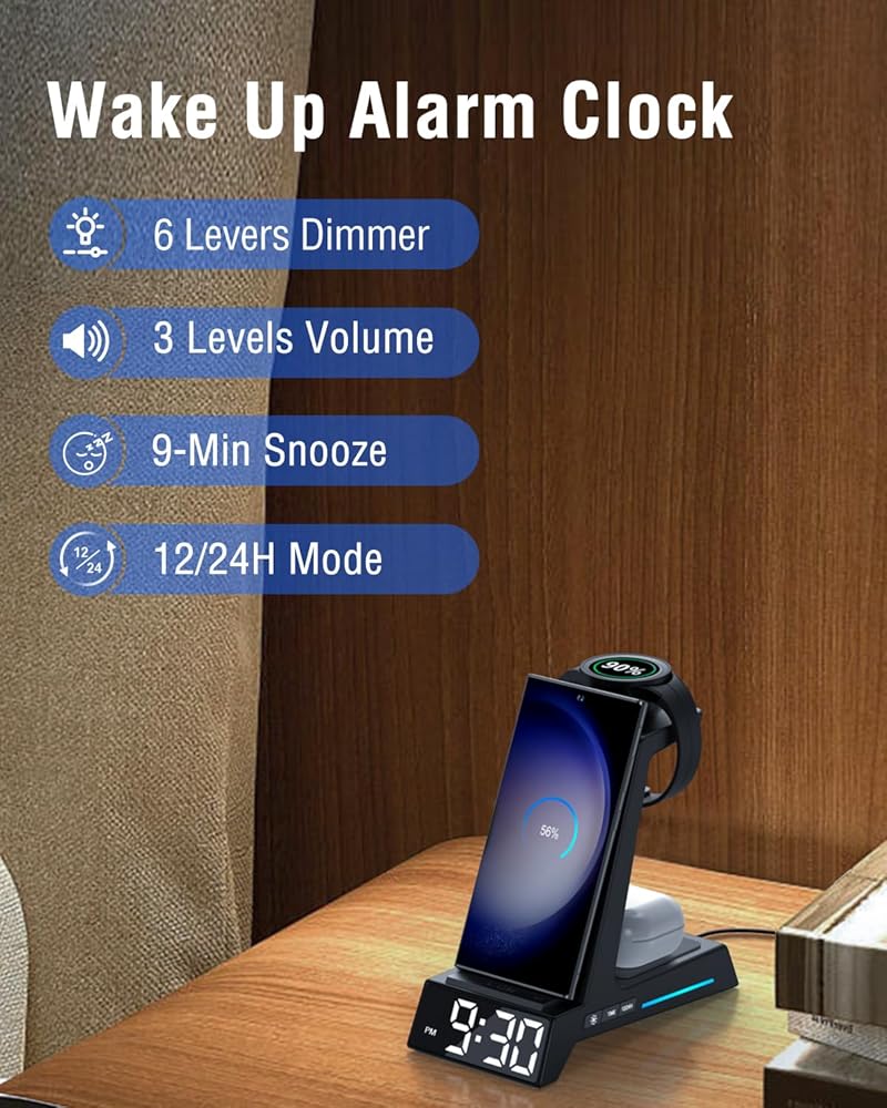 • قم بتنشيط صباحك دون عناء من خلال المنبه المتطور ومحطة الشحن اللاسلكية! تضمن لك الأرقام كبيرة الحجم سهولة القراءة في الوقت المحدد وبأسلوب أنيق. قم بتشغيل هاتف سامسونج والساعة وسماعات الأذن في نفس الوقت دون أي متاعب! مع استعادة مساحة المنضدة الثمينة والتخلص من الفوضى. مثالي لغرفة النوم أو المكتب أو السفر.