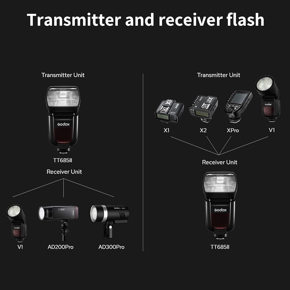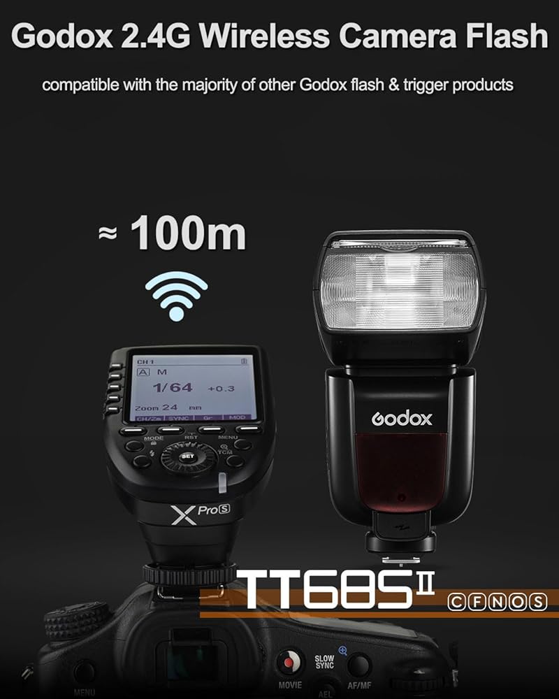 فلاش Godox TT685II-S مدمج مع نظام Godox 2.4G اللاسلكي X للحصول على اتصال سلس مع الفلاش المتوافق أو مشغلات الفلاش. تضمن المجموعة الواسعة من المجموعات والقنوات عملية تصوير موثوقة دون أي تدخل. وGodox TT685II-S HSS Speedlight مع جهاز إرسال فلاش لاسلكي Godox Xpro-S متوافق مع كاميرات سوني.