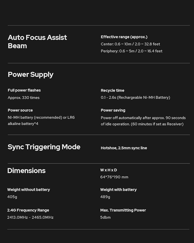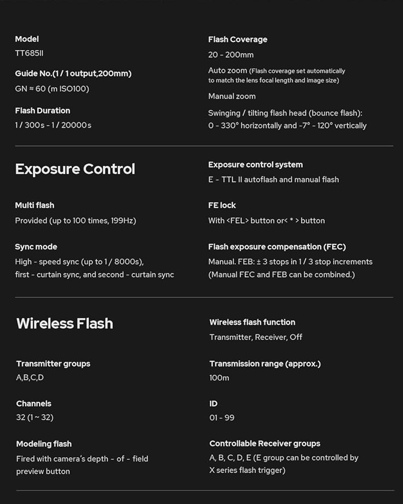 يواصل Godox TT685II-S Speedlite الوظائف في وضع TTL واليدوي والفلاش المتعدد. ضمن وضع TTL، تساعدك جميع الوظائف مثل المزامنة عالية السرعة (HSS) حتى 1/8000 ثانية، وFEC، وFEB، ومزامنة الستارة الخلفية، وما إلى ذلك على التقاط كل لحظة رائعة بسرعة ودقة وإبداع. في الوضع اليدوي، هناك 22 خطوة لإخراج الطاقة من 1/1 إلى 1/128 للتعديل المجاني.