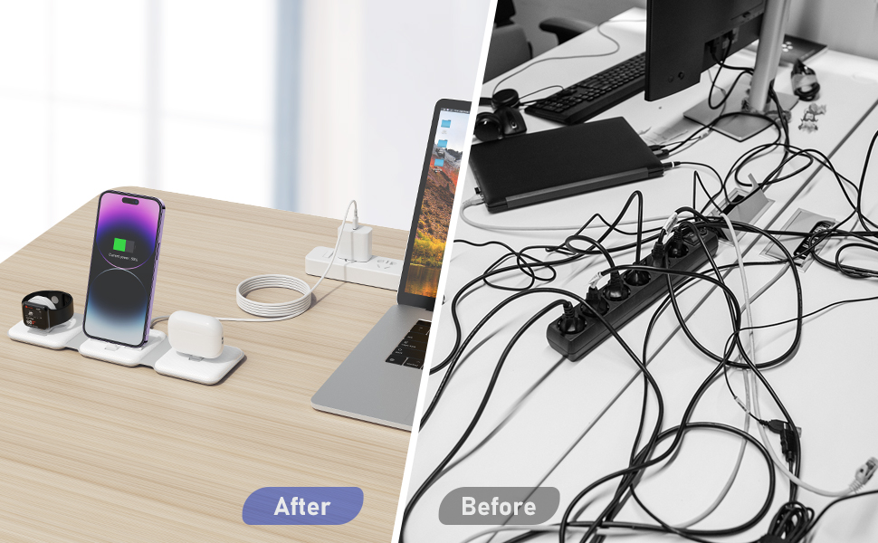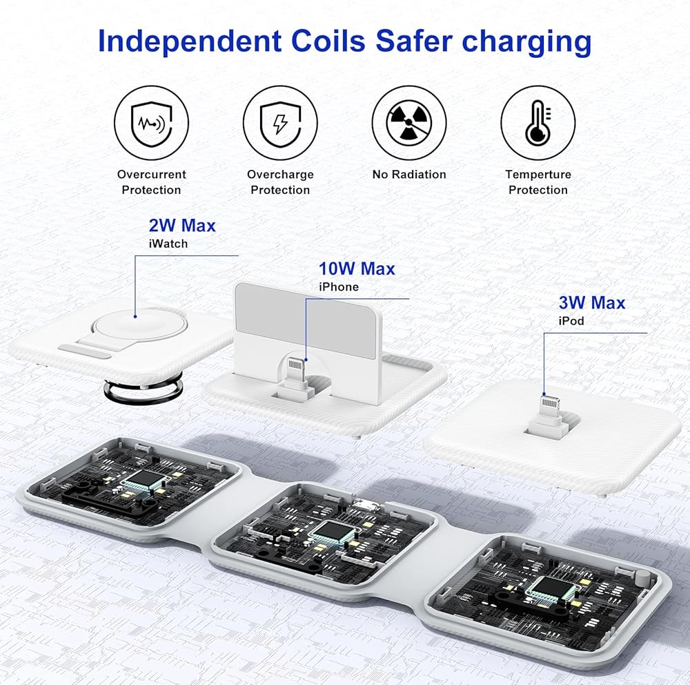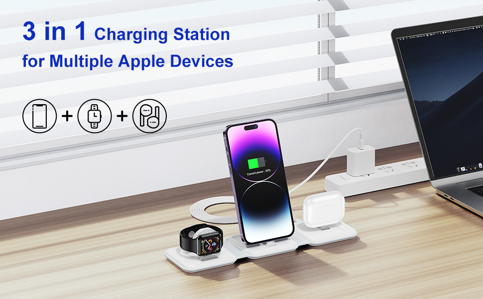 شاحن لاسلكي 3 في 1: 10 واط كحد أقصى لأجهزة iPhone، و3 واط كحد أقصى لأجهزة AirPods، و2 واط كحد أقصى لساعة Apple Watch المغناطيسية. مدعوم بمحول 12 واط المتضمن، المتوافق مع شاحن iPhone اللاسلكي مع ملف ترقية مدمج، يمكن زيادة سرعة الشحن بنسبة 35%. يمكنك شحن منتجات Apple الخاصة بك في وقت واحد من خلال محطة الشحن اللاسلكية 3 في 1. شحن جهاز iPhone وApple Watch وAirPods في نفس الوقت.