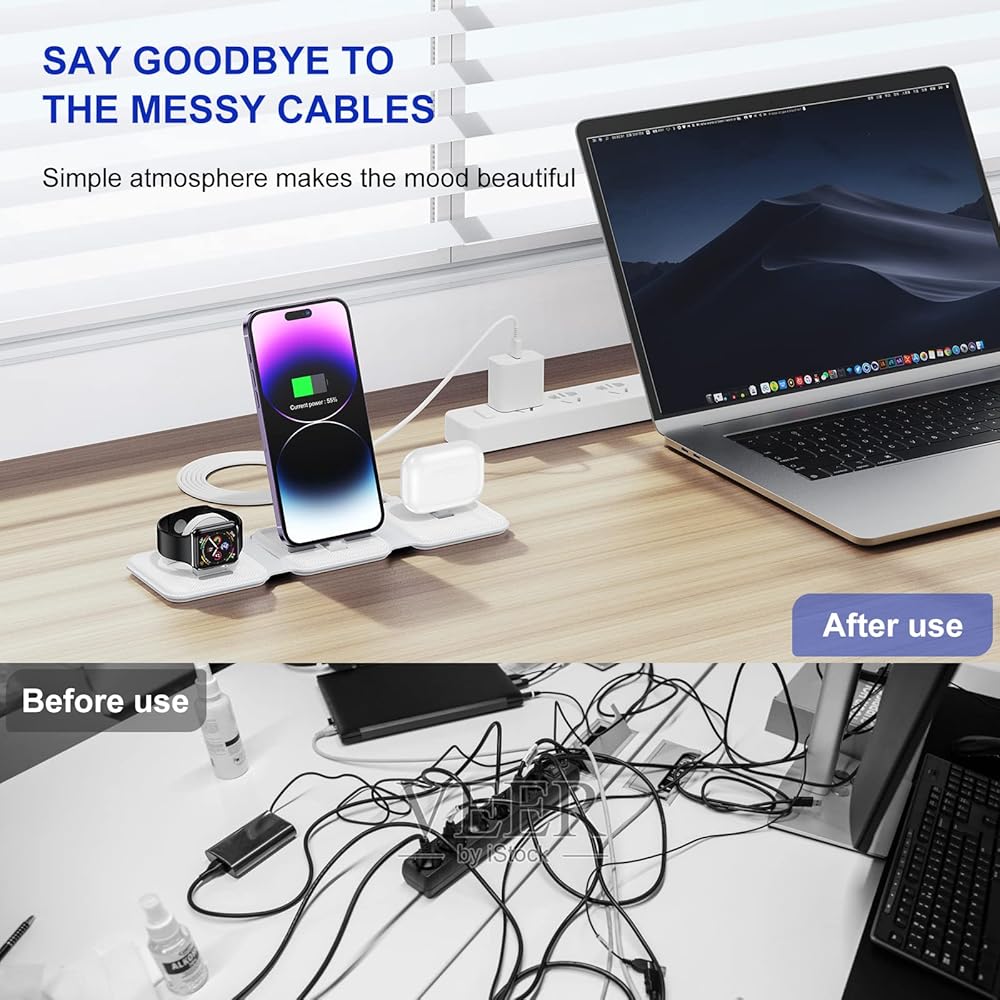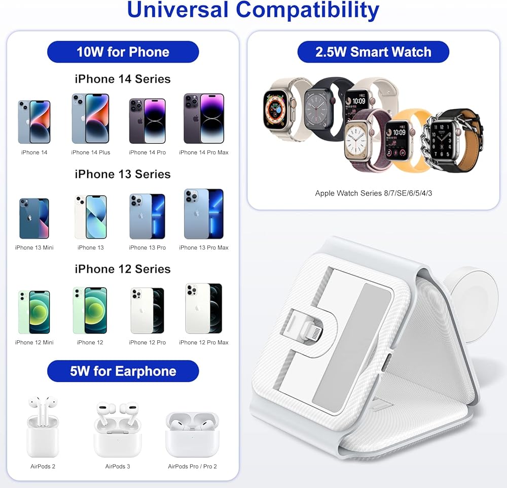 توافق Unierasl: محطة شحن مثالية لأجهزة Apple المتعددة، والملحقات لمعظم سلاسل iPhone، وسلسلة iWatch، وسلسلة AirPods. 10 واط كحد أقصى آيفون 14/14 برو/14 برو ماكس/14 بلس/13 ميني/13/13 برو/13 برو ماكس/12 ميني/12/12 برو/12 برو ماكس/11/11 برو/11 برو ماكس/XR /XS/XS Max/8 Plus/8/7 Plus/7/6S Plus/6S/6/6 Plus/SE.3W Max لـ AirPods 2/ AirPods Pro /AirPods Pro 2/ AirPods 3؛ 2 واط كحد أقصى لساعة أبل UItra/8/7/6/ SE/ SE 2/ 5/ 4/ 3/ 2.