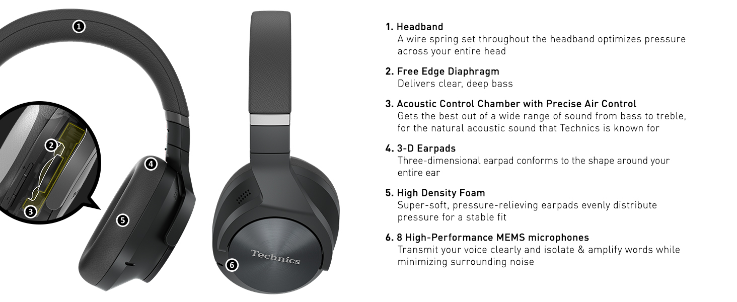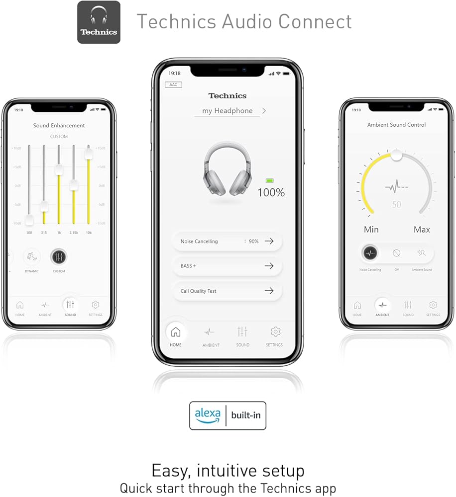 تحدث بوضوح: مع 8 ميكروفونات مميزة وتقليل ضوضاء الرياح المتقدم، تنقل سماعات الأذن Technics A800 صوتك بوضوح، مع تقنية تعمل على تضخيم الكلمات وتقليل الضوضاء المحيطة