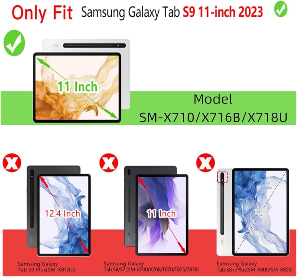 توافق مثالي: متوافق مع Samsung Galaxy Tab S9 11 بوصة (موديل SM-X710/X716B/X718U) / Samsung Galaxy Tab S9 FE 10.9 بوصة (موديل SM-X510/X516B/X518U) إصدار 2023. لن يعمل مع أي طراز آخر من الأجهزة. يرجى التحقق من النموذج الخاص بك بعناية، وتجنب الشراء عن طريق الخطأ.