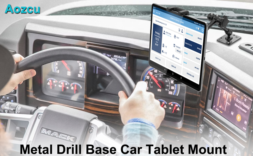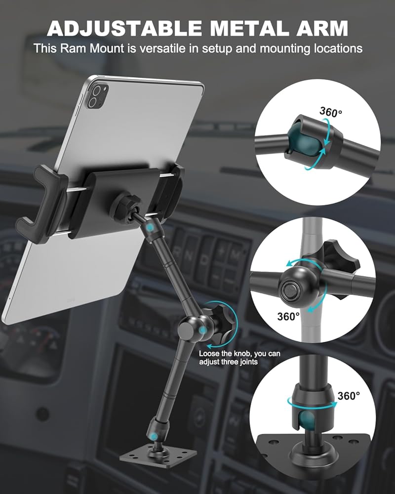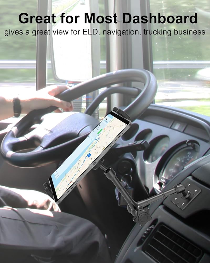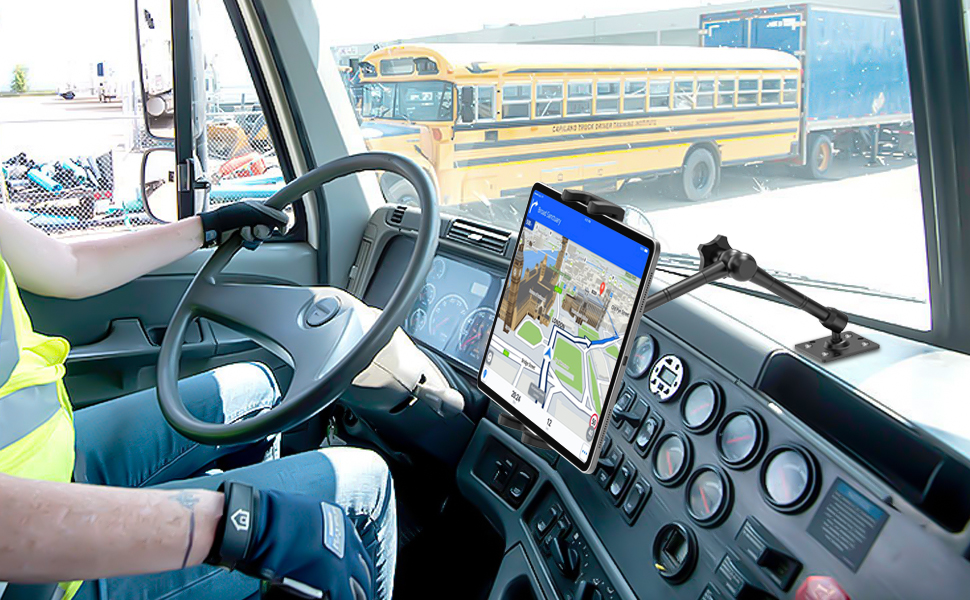 حامل تابلت لتابلوه السيارة مناسب جدًا لأجهزة التحكم عن بعد لمسافات طويلة، اي ال دي، خدمة أفضل لأعمال النقل لمسافات طويلة. يمكن أيضًا استخدام حامل التابلت للشاحنات شبه الشاحنات والمركبات الترفيهية والمخيمات والشاحنات الصغيرة لشاحنات توصيل المركبات التجارية والطيران والنقل الزراعي. توجد 7 فتحات في قاعدة المثقاب لحامل التابلت، والتي يمكن تركيبها بشكل شبه دائم باستخدام البراغي (نقدم ملحقات براغي للمستخدمين، وهي سهلة التركيب).