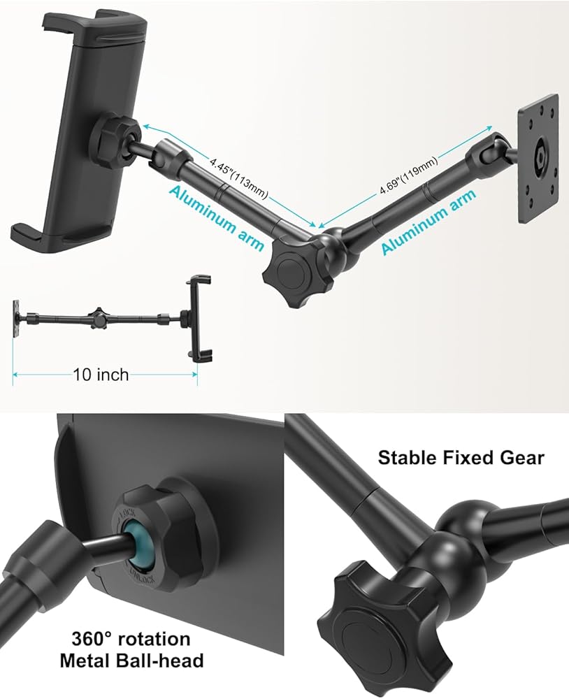 ذراع سحري قابل للطي - يحتوي حامل التابلت السحري القابل للطي مقاس 10 انش على عجلة شد مطورة خصيصًا، وهي مقبض محكم يغلق ثلاثة مفاصل وزاوية 360 درجة، محكم ومستقر. لن يحجب الرؤية أثناء القيادة، مما يوفر للسائق زاوية تنقل آمنة ومريحة. خاصة لسائقي الشاحنات، يمكن أن يساعد هذا التصميم سائقي الشاحنات على تقليل الوقت الذي يقضيه في تشغيل الملاحة أو الهواتف المحمولة، وضمان قيادة السائقين بأمان أكبر.