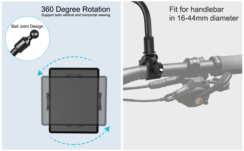 【قابل للدوران 360 درجة للمشاهدة】يعتمد حامل تابلت الدراجة هذا على تصميم مفصل كروي جديد، لذلك يمكن تدوير الدعامة 360 درجة (رأسيًا أو أفقيًا) للحصول على زاوية رؤية مريحة.