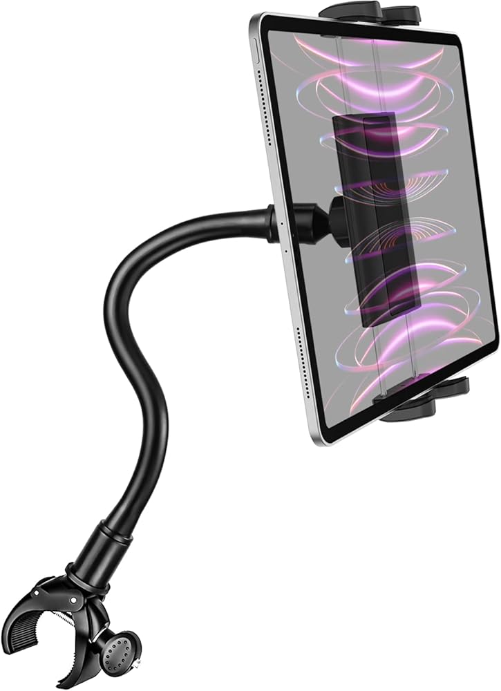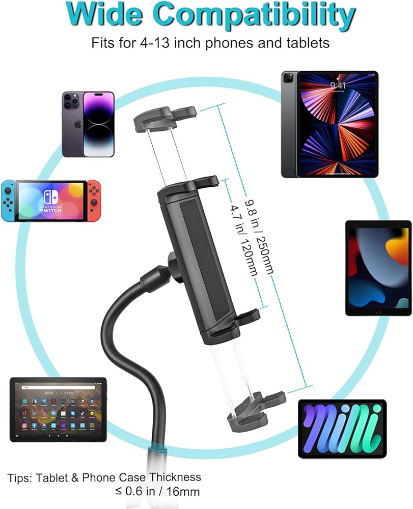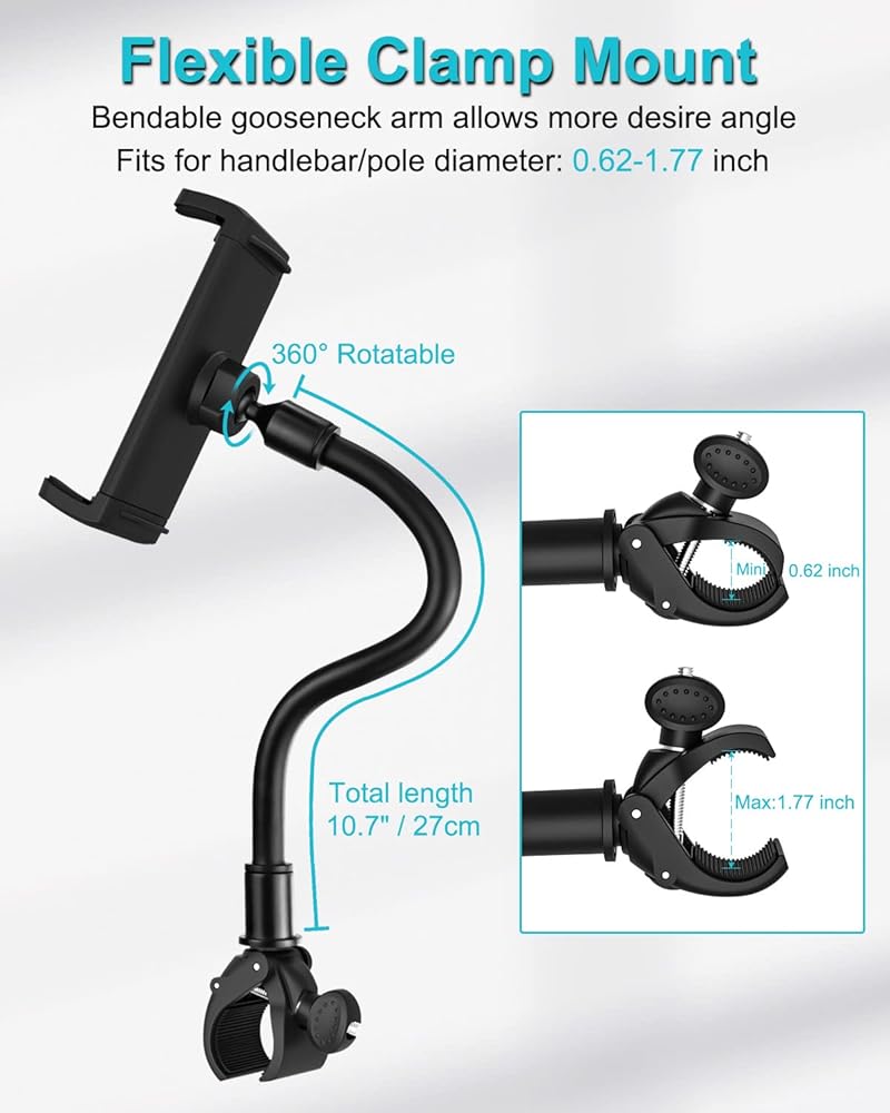 【متين وقابل للانحناء】عنق الإوزة مصنوع من قلب ألومنيوم مطور وملفوف ببلاستيك ABS عالي الجودة، مما يجعله أكثر متانة وثباتًا. طول الذراع: 10.7 بوصة (27 سم). يتميز المشبك بتصميم وسادة سيليكون غير قابلة للانزلاق لحماية التابلت من الخدوش أو السقوط.