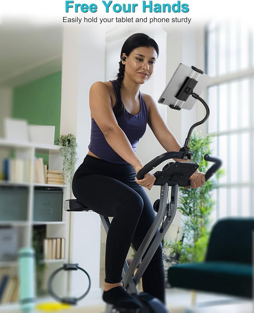 【حرر يديك】مع حامل التابلت هذا يمكنك تحرير يديك أثناء مشاهدة مقاطع فيديو اللياقة البدنية أو الاستماع إلى الموسيقى أثناء التمرين. شريك رائع لتدريبات ركوب الدراجات في الأماكن المغلقة.