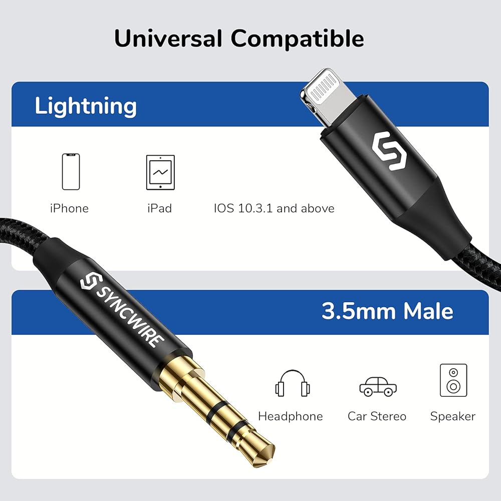 【ما تحصل عليه: يمكنك الحصول على كابل صوت Syncwire بطول 3.3 قدم من Lightning إلى 3.5 مم، يرجى التأكد من اختبار سلك Lightning إلى aux عدة مرات لضمان حصولك على منتجات عالية الجودة.