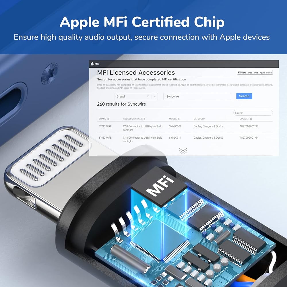 【معتمد من Apple MFi الحقيقي】أكمل سلك Syncwire aux لجهاز iPhone متطلبات شهادة Apple MFi. أدخل طراز الكابل (SW-SC635) واختر "بحث"، ثم يمكنك عرض معلومات MFi المتعلقة بكابل aux الذي تريد معرفته. (على صفحة Apple MFi)