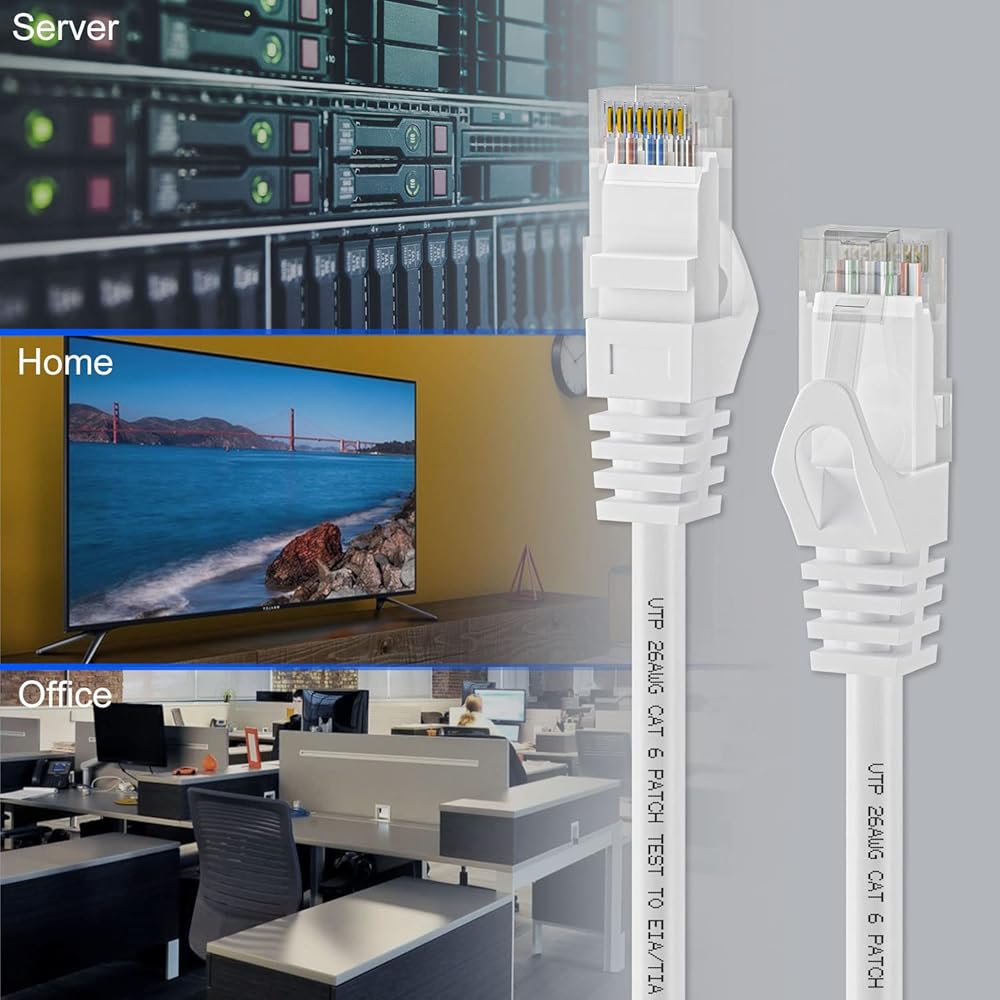 التوافق العالمي للشبكات: يستخدم كابل التصحيح Cat 6 Ethernet موصل RJ45 لتوفير اتصالات عالمية من أجهزة الكمبيوتر والطابعات والخوادم وأجهزة التوجيه إلى مشغلات وسائط الشبكة وأجهزة تخزين الشبكة وهواتف VoIP وغيرها من المعدات المكتبية القياسية.