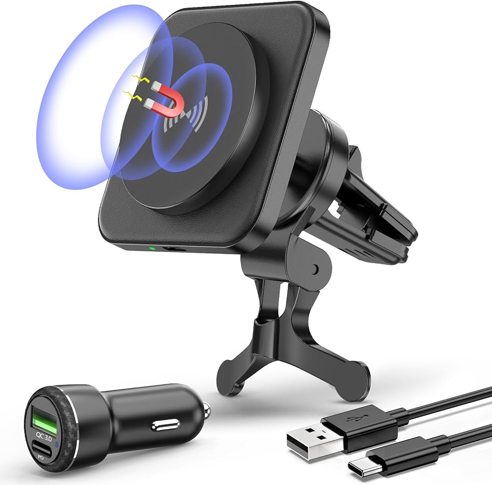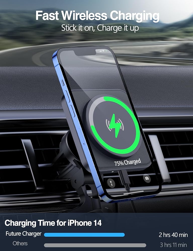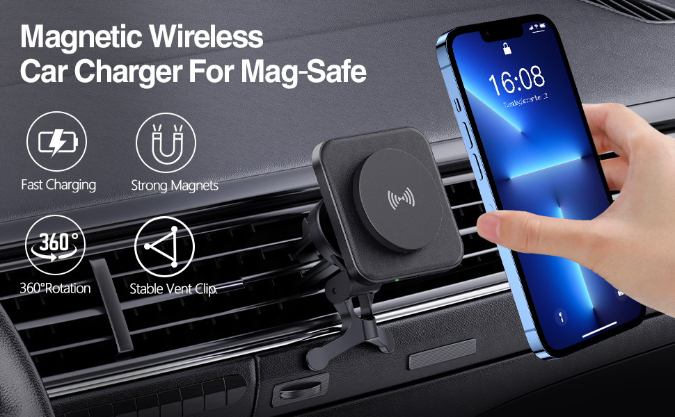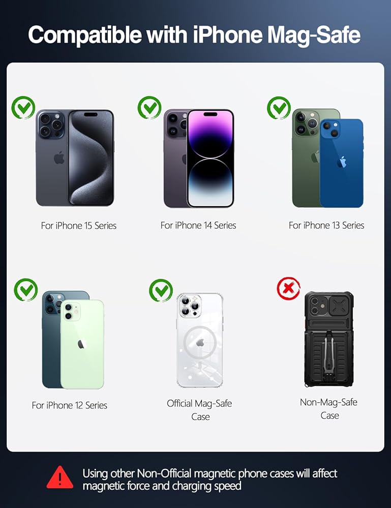 【مصمم خصيصًا لسلسلة iPhone 15/14/13/12】: تصميم لشاحن السيارة اللاسلكي Mag-safe، شاحن المستقبل متوافق مع iPhone 15 Pro Max/15 Pro/15 Plus/15/14 Pro Max/14 Pro/ 14 Plus/14/13 Pro Max/13 Pro/13/13 Mini/12 Pro Max/12 Pro/12/12 Mini بدون حافظة أو مع حافظات مغناطيسية رسمية. ملحوظة: غير متوافق مع الجرابات غير المغناطيسية. 【ملاحظة: يجب أن تحتوي سلسلة iPhone 8-11 وSamsung Galaxy وGoogle Pixel على حافظات MagSafe/مغناطيسية.
