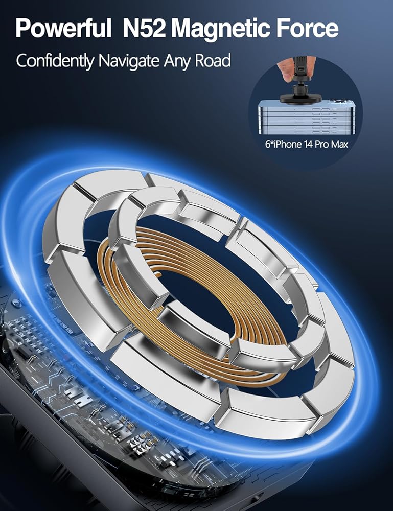 【قوة مغناطيسية قوية للغاية】: حامل شاحن السيارة اللاسلكي المغناطيسي مدمج بمغناطيس قوي 18x N52 مع قوة شفط 1400 جرام، مما يحافظ على هاتفك آمنًا حتى على الطرق الوعرة.