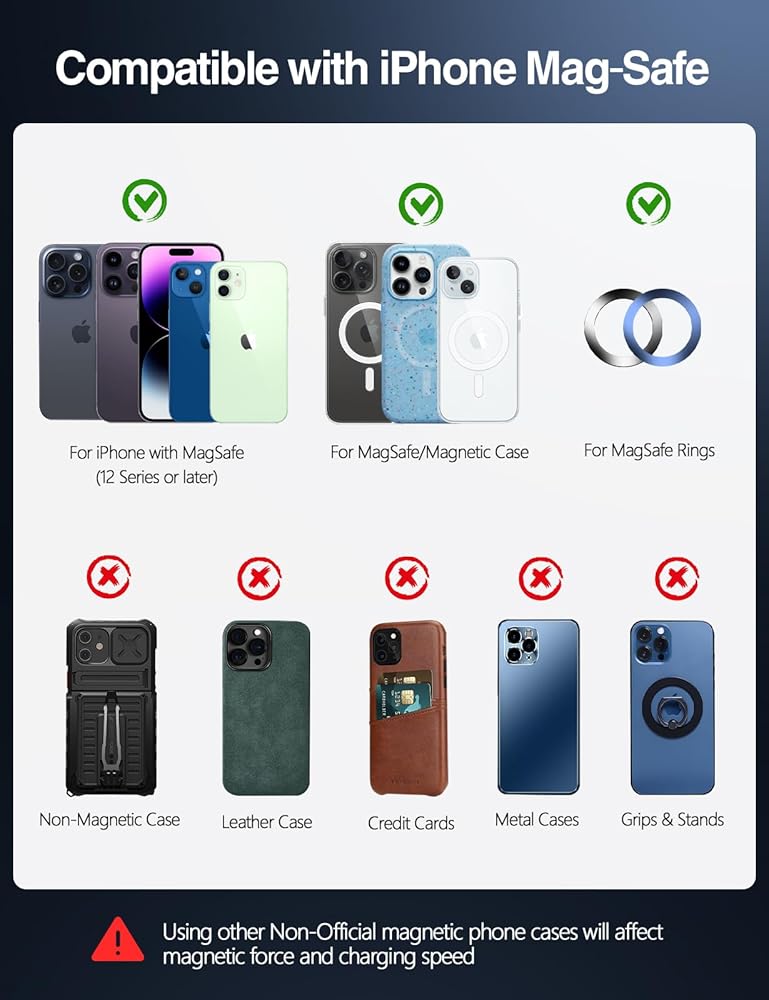موديلات الهواتف المتوافقة: حصريًا لسلسلة iPhone 15/14/13/12. 【ملاحظة: يجب أن تحتوي سلسلة iPhone 8-11 وSamsung Galaxy وGoogle Pixel على حافظات MagSafe/مغناطيسية.