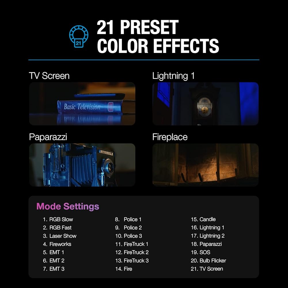 21 لونًا مضبوطًا مسبقًا - يوفر مصباح الفيديو LC360 تأثيرات الألوان الـ 21 التالية المحددة مسبقًا لمساعدتك على تحقيق مظهر أو مزاج معين في التصوير الفوتوغرافي أو تصوير الفيديو. RGB بطيء، RGB سريع، عرض ليزر، ألعاب نارية، EMT 1، EMT 2، EMT 3، بوليس 1، بوليس 2، بوليس 3، فاير تراك 1، فاير تراك 2، فاير تراك 2، فاير تراك 3، فاير تراك 3، فاير تراك، كاندل، لايتنينج 1، لايتنينج 2، بابارازي، اس او اس، لمبة فليكر، وشاشة التلفزيون.