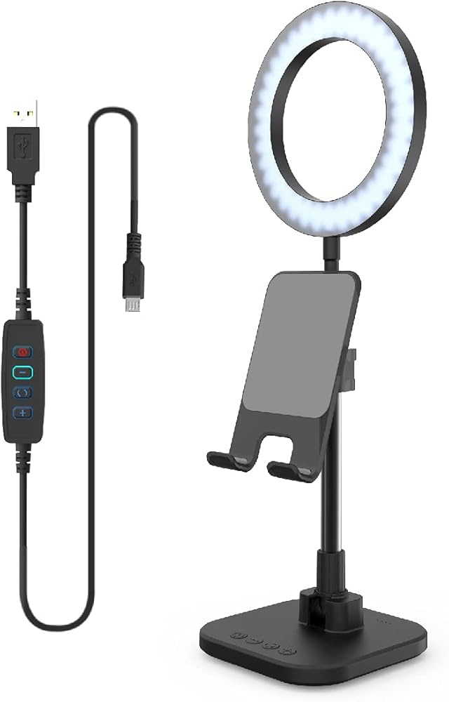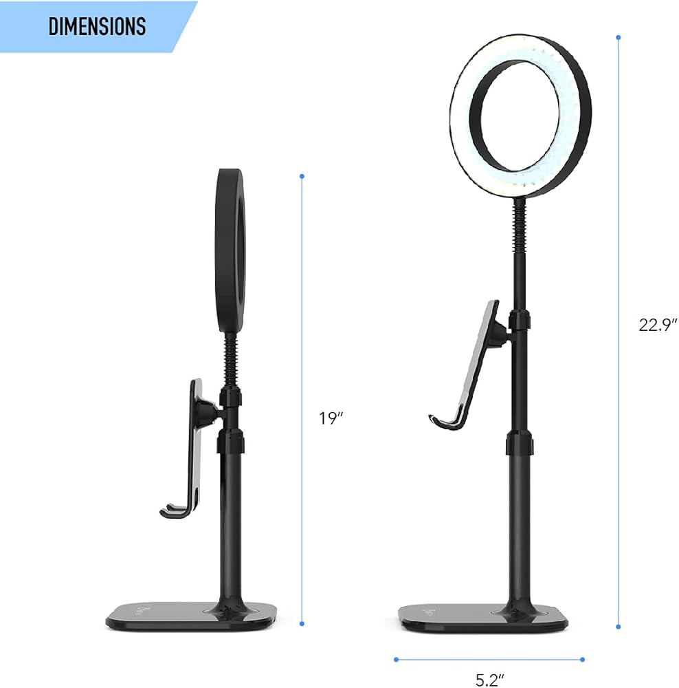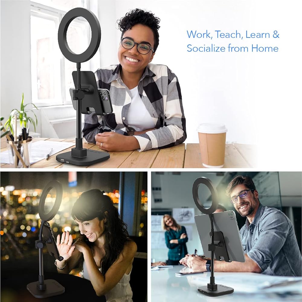 ديجباور مصباح مكتب حلقي LED DP-WSH-PH6 مع حامل للهواتف الذكية والتابلت بما في ذلك البطارية، ارتفاع قابل للتعديل، لمكالمات الفيديو في مكان العمل والمدرسة المنزلية، لون اسود وابيض