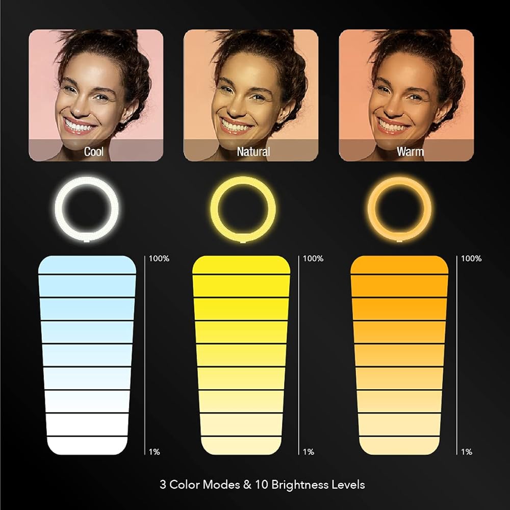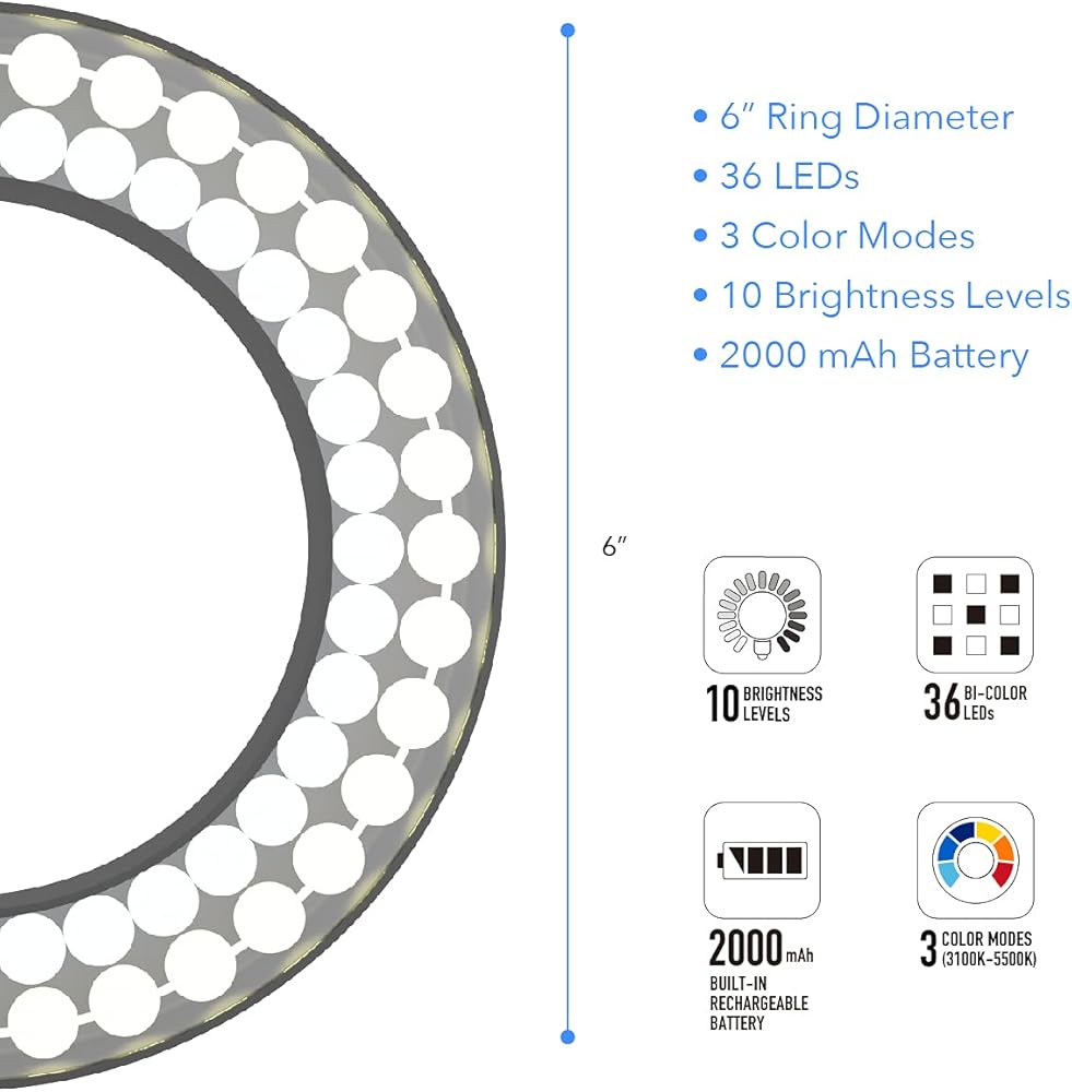 يحتوي المصباح الحلقي مقاس 6 انش على 3 أوضاع إضاءة (دافئ وبارد وطبيعي) و10 مستويات سطوع وبالتالي يضمن تعريضًا لطيفًا. يمكن تعديل درجة حرارة اللون وسطوع 36 مصباح LED الحلقي على القاعدة.