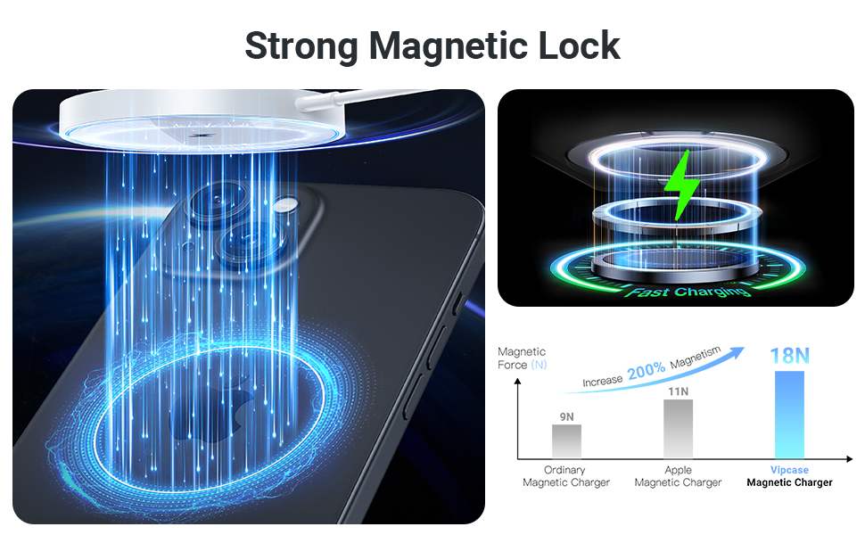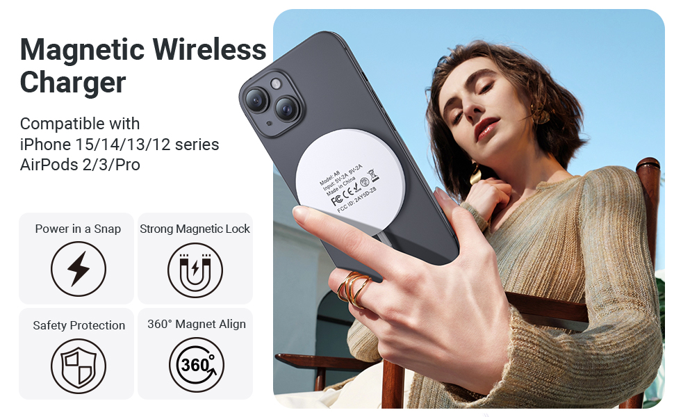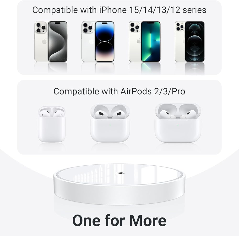 مرفق قوي: مزود بمغناطيسات قوية للغاية يتم ربطها بقوة بالجزء الخلفي من سلسلة iPhone 15/14/13/12/AirPods 2/3/Pro. يضمن محاذاة مثالية وشحن لاسلكي فعال