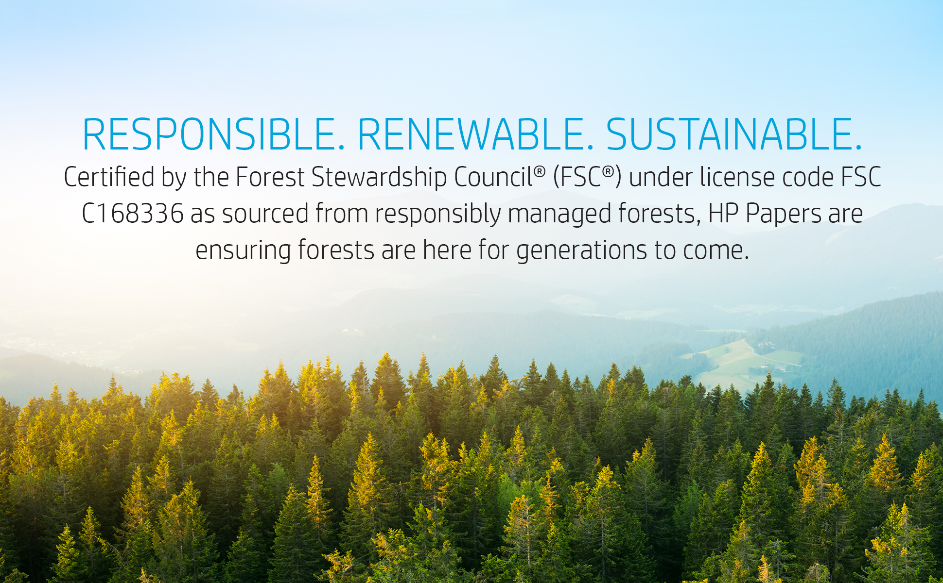 صُنع في الولايات المتحدة الأمريكية - يتم الحصول على أوراق HP من موارد الغابات المتجددة وقد حققت إنتاجًا بنسبة 0% من إزالة الغابات في أمريكا الشمالية. انظر الصور.