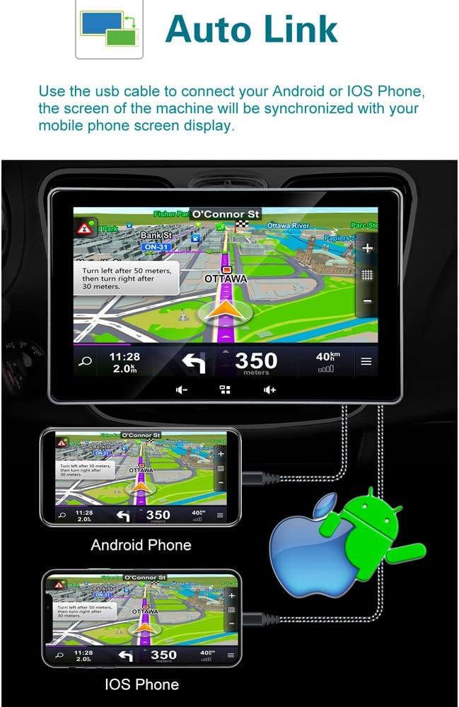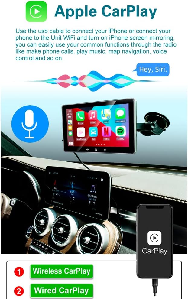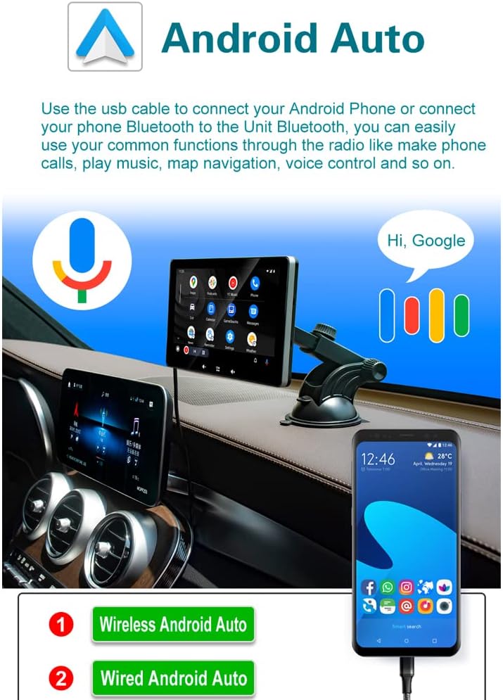 【متوافق مع ابل كاربلاي واندرويد اوتو】 يمكنك استخدام ابل كاربلاير أو اندرويد اوتو في السيارة دون الحاجة إلى توصيل الهاتف المحمول عبر الكابل. يمكنك الوصول إلى الموسيقى والتنقل والرسائل وغيرها من وظائف هاتفك أثناء القيادة الآمنة. يمكنه استبدال الهاتف الخلوي بالكامل أثناء القيادة. لا تقلق أبدًا بشأن التسخين وتلف البطارية الناتج عن استخدام هاتفك المحمول للتنقل لفترة طويلة.