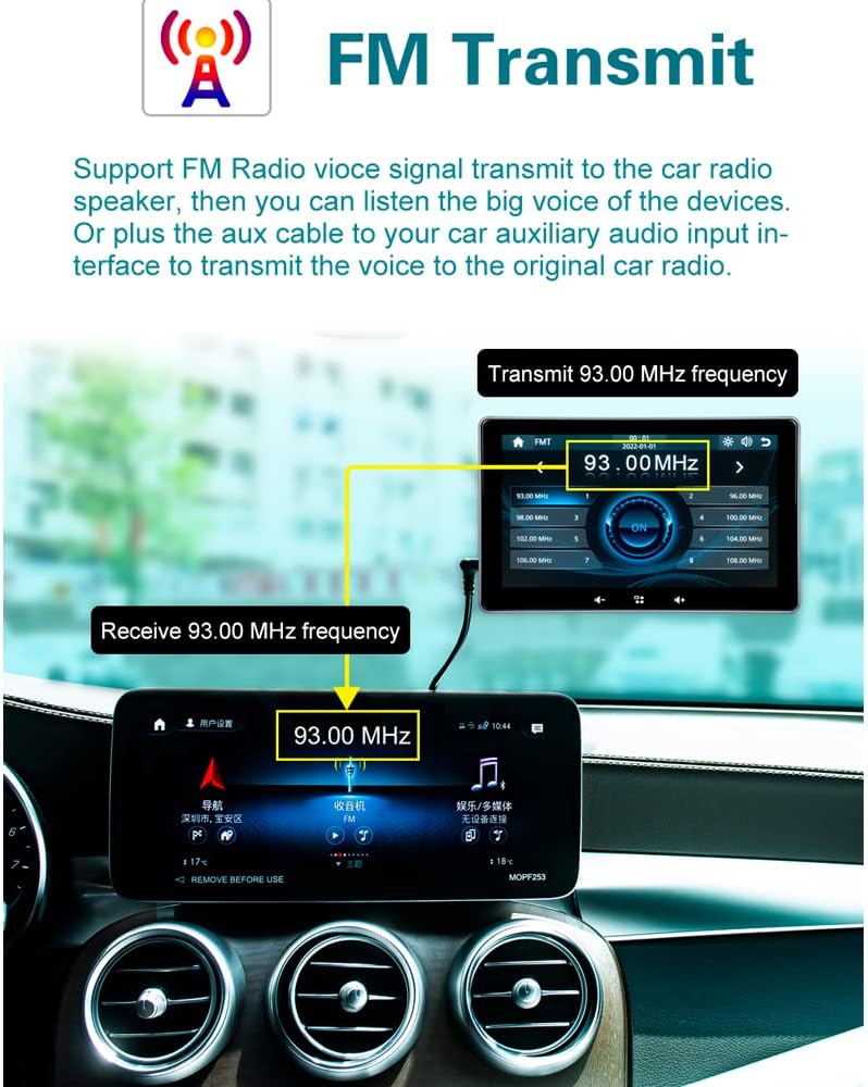 【مزامنة الصوت، مكبر صوت مدمج】تحتوي الشاشة على مكبر صوت خاص بها، والذي يمكنه إصدار صوت. عندما يتم ضبط تردد اف ام للشاشة على تردد راديو السيارة، يمكن أيضًا إرسال الصوت الذي تشغله الشاشة على راديو السيارة. لاحظ أنه عندما يكون شعار اف ام الخاص بالشاشة قيد التشغيل، لا يمكن لمكبرات الصوت الخاصة بالشاشة إنتاج صوت. يجب إيقاف تشغيل مفتاح اف ام. تُستخدم هذه الوظيفة فقط لنقل الصوت، ولا يمكن للشاشة الاستماع إلى محطات اف ام.