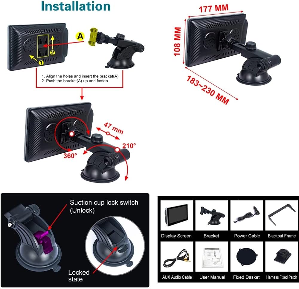 【سهل التركيب】يدعم مصدر الطاقة 9 فولت - 36 فولت، يمكن لراديو كاربلاي هذا استخدام قفل الشفط المثبت بأمان على لوحة القيادة أو تثبيته على الزجاج الأمامي باستخدام كوب شفط قوي، ثم اضبط الارتفاع والطول وفقًا للعادات البصرية الشخصية، تدعم القاعدة الدوران 360 درجة، التوصيل والتشغيل، حتى تتمكن من توفير الكثير من تكاليف التركيب.