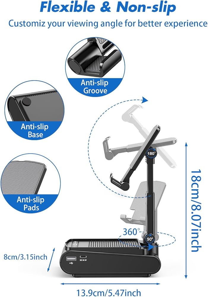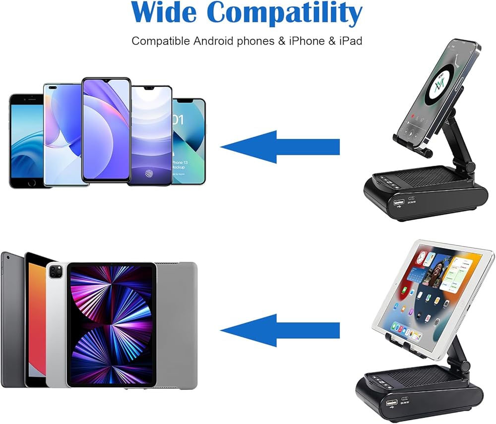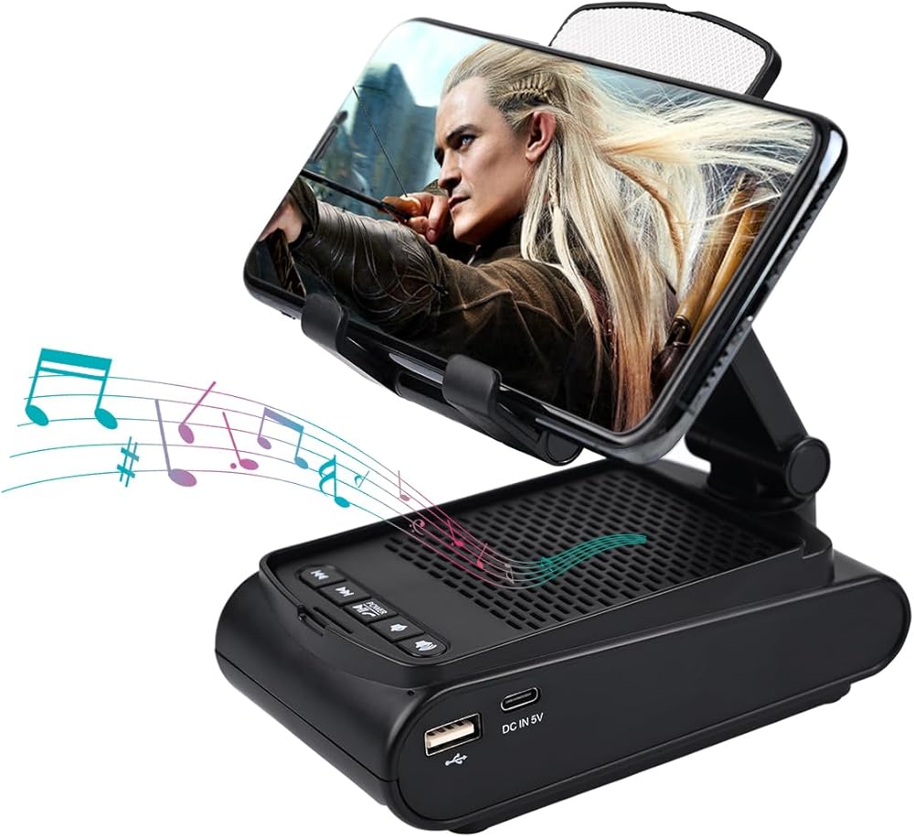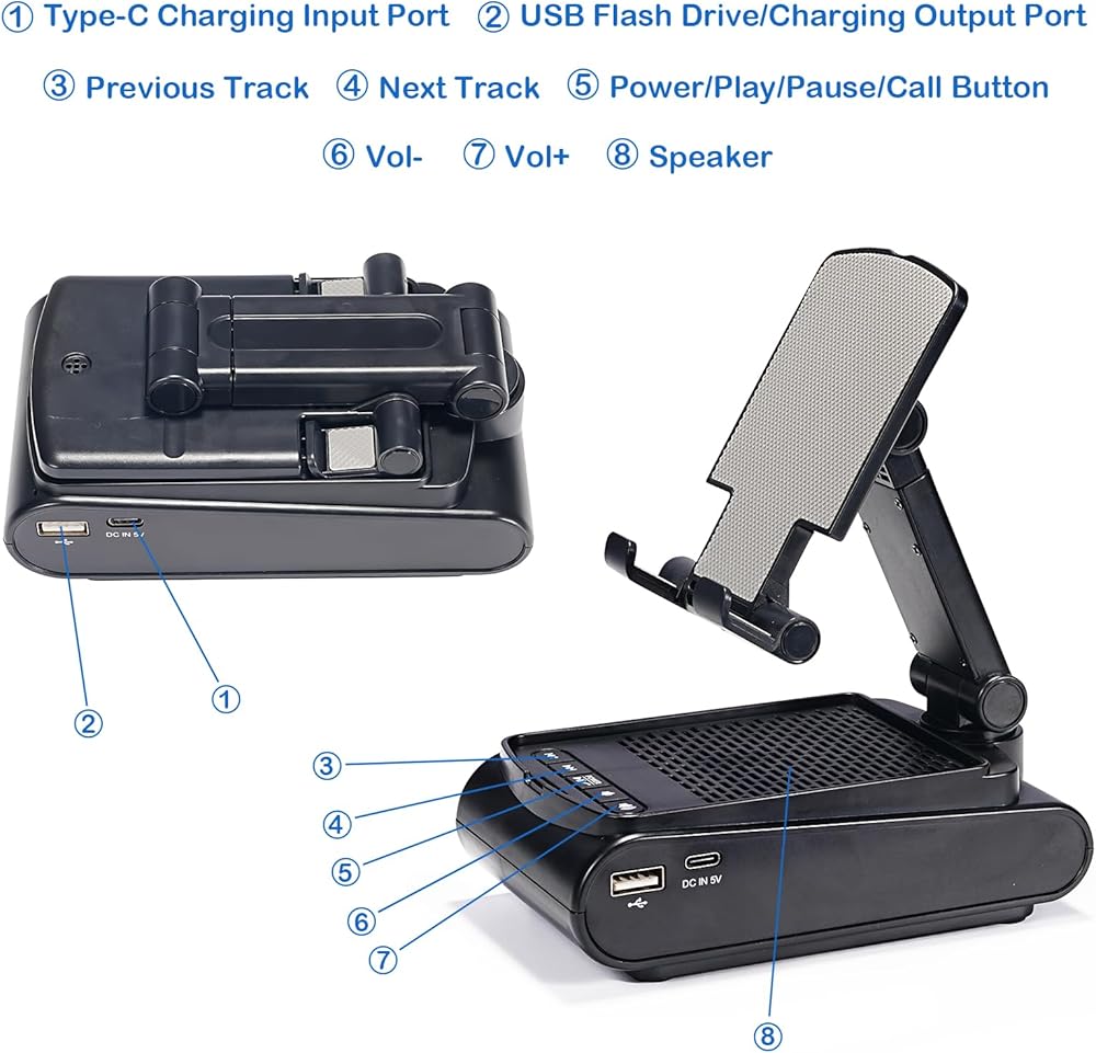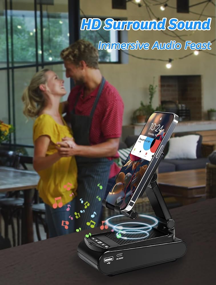 حامل مكبر صوت بلوتوث لاسلكي بزاوية قابلة للتعديل: يمكن تعديل زوايا متعددة لتلبية متطلبات المشاهدة المختلفة، مما يجعلك حر اليدين للاستمتاع بمقاطع الفيديو والألعاب والطهي والفيس تايم. علاوة على ذلك، يمكن طيها لسهولة حملها لحجمها الصغير.