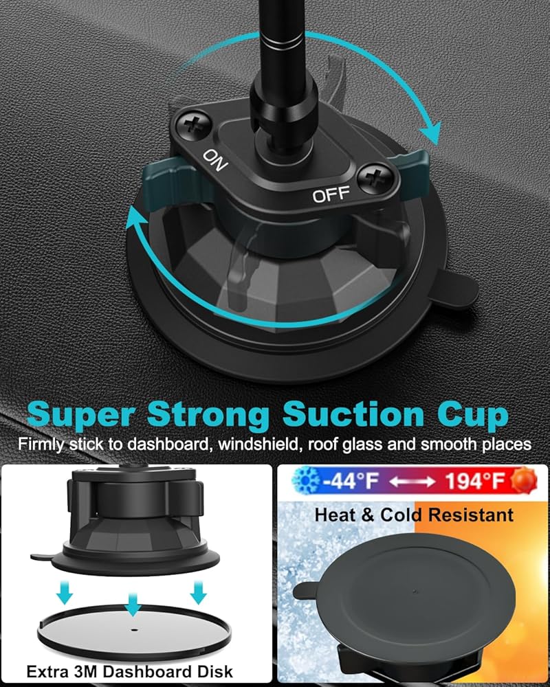 【Super Suction Cup】Car tablet mount adopts a large vacuum suction cup (diameter: 3.34 "), which has stronger suction power than ordinary suction cups. Just turn the knob to lock the suction cup. Even on bumpy and rugged mountain roads, it remains firmly attached to the car and maintains strong suction. Unlike sticky suction cups, vacuum suction cups leave no trace. Works well even in cold or hot weather. (The disk prepared for uneven surface makes the tablet holder fit for more occasions)