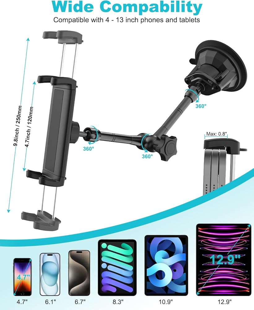 【Wide Compability】Car glass tablet holder has spring clips that pull out and retract which makes it very easy to put the device in or take it out. Tablet clamp is fit for 4-13" device with thin or thick case, such as iPad Pro 12.9 11, iPad 10.5 9.7 10.2, iPad Air 5th 4 3 2, iPad Mini 6 5 4 3 2, Samsung Galaxy Tab S8 S7 S6/A8 A7 A6 Z Fold Series S22 S21, Android Tablet, iPhone 14 13 12 11 Pro Max Mini, Xs XR X 8s, Surface.(The clip is equipped with silicone to protect the device from scratches.)