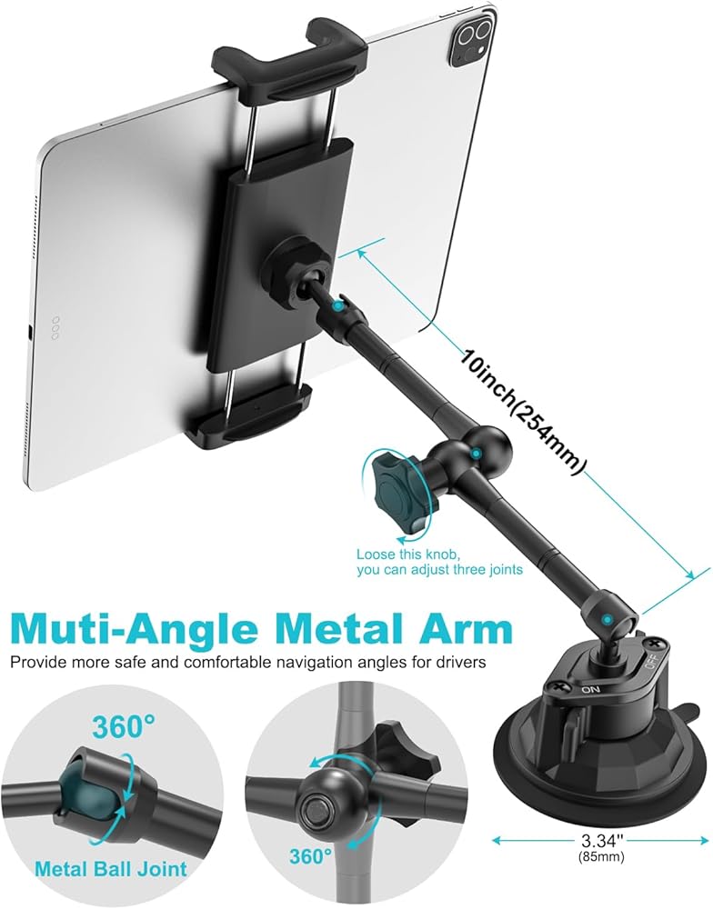 【Sturdy & Safe】Dash tablet mount is made of metal. There are gears on the metal joints to prevent the adjusting arm from shaking and falling. The 10inch adjustable arm tablet holder has a specially upgraded knob, one knob can control three joints, allowing the arm to fold and lock easilyand the metal ball head supports 360° rotation. It reduce the driver's time operating navigation or tablet. This is friendly for drivers. Provide drivers with a safe and comfortable navigation angle.